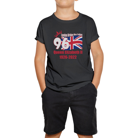 London Bridge Has Fallen 96 Years of Queen Elizabeth II Union Jack British Uk Flag Kids Tee