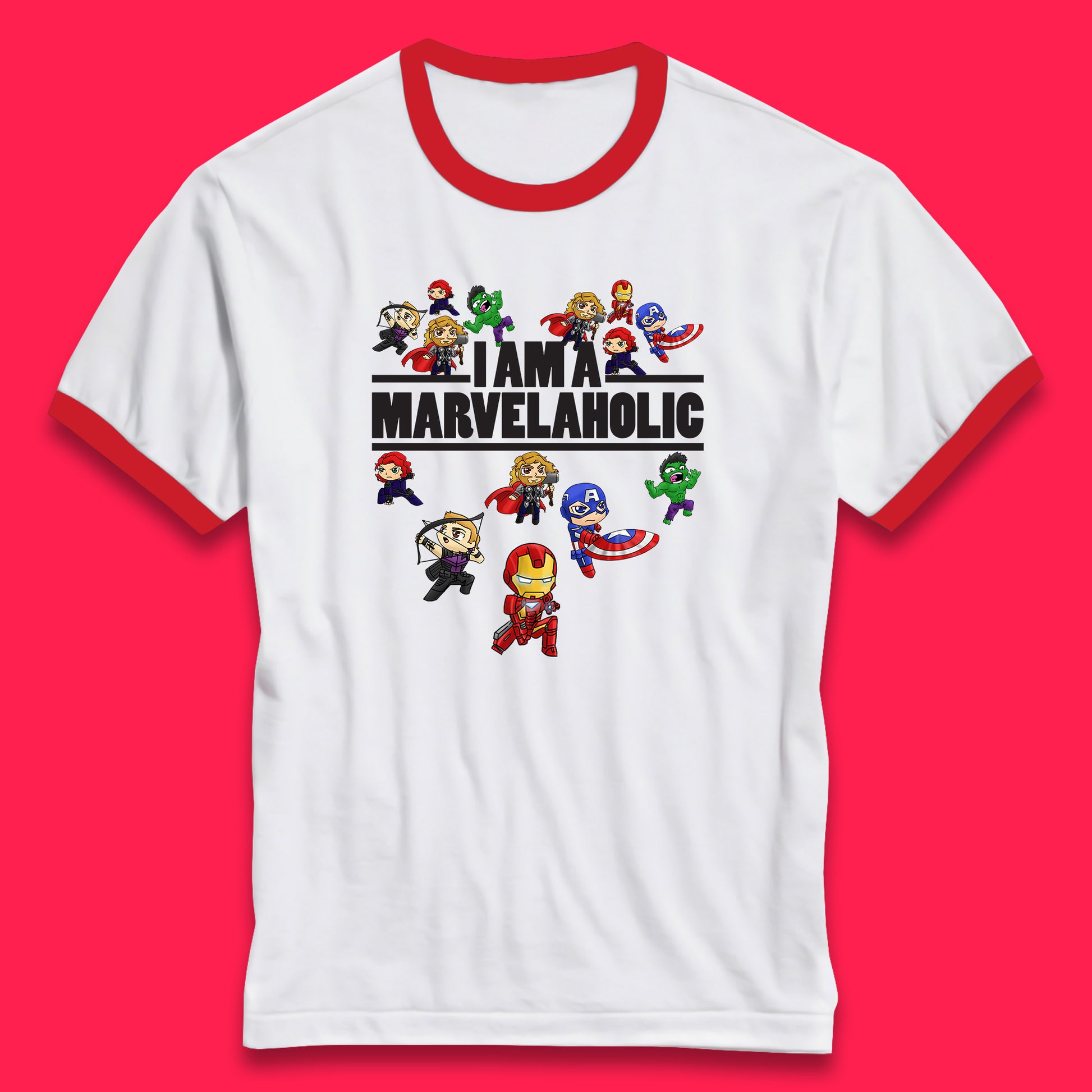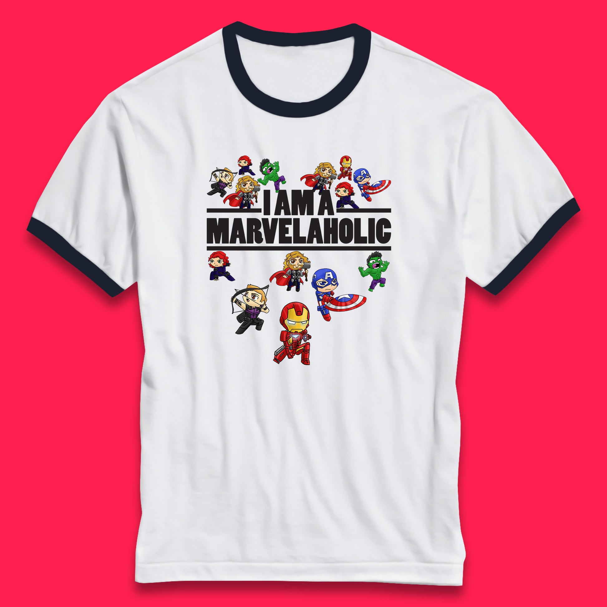I Am A Marvelaholic Marvel Avengers Super Heroes Movie Characters Black Widow, Hulk, Iron Man, Thor, Captain America Ringer T Shirt
