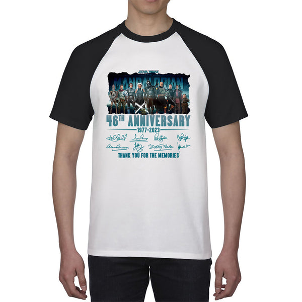 Disney Star Wars Day 46th Anniversary 1977-2023 The Mandalorian Characters Signatures Thank You For The Memories Baseball T Shirt