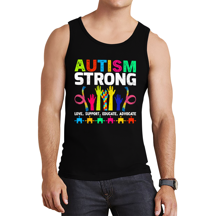 Promote autism awareness with ease and style in our "Autism Strong Love Support Educate Advocate" Tank Top. This chic and breathable tank is perfect for staying cool while making a powerful statement of support and advocacy.
