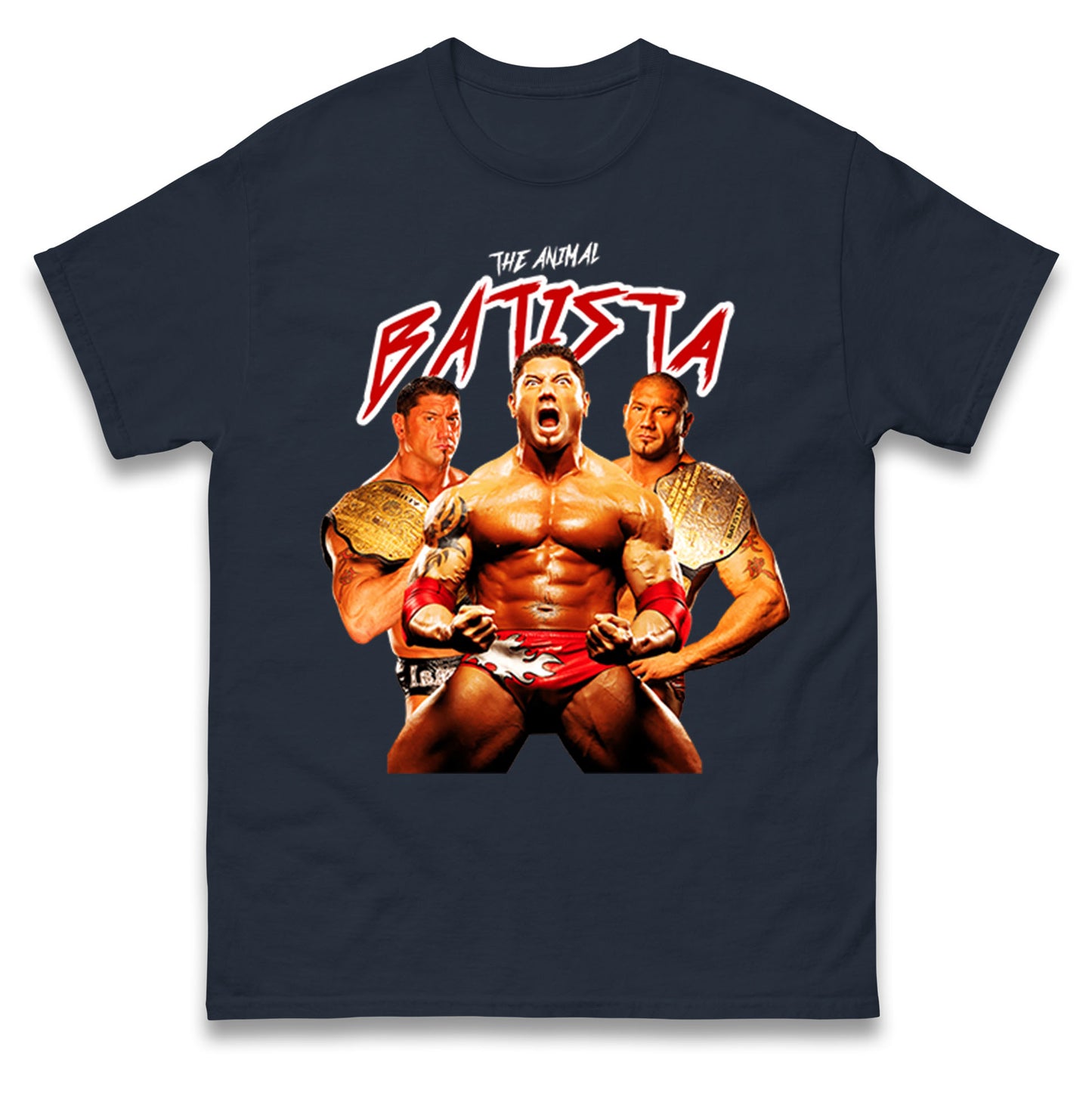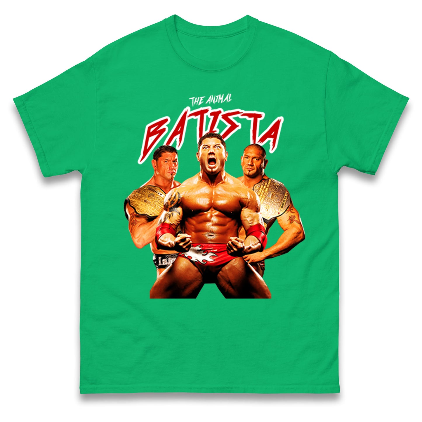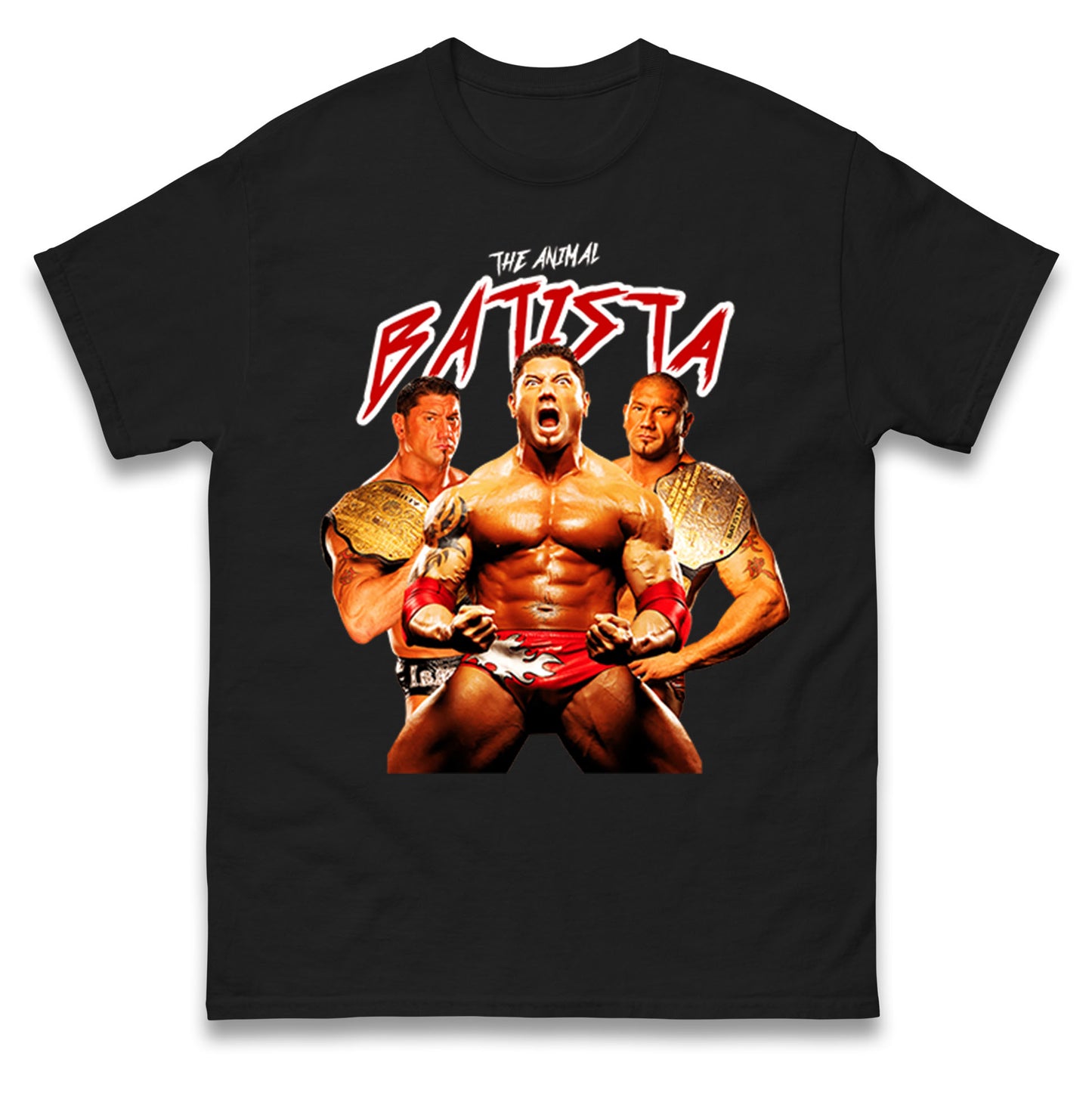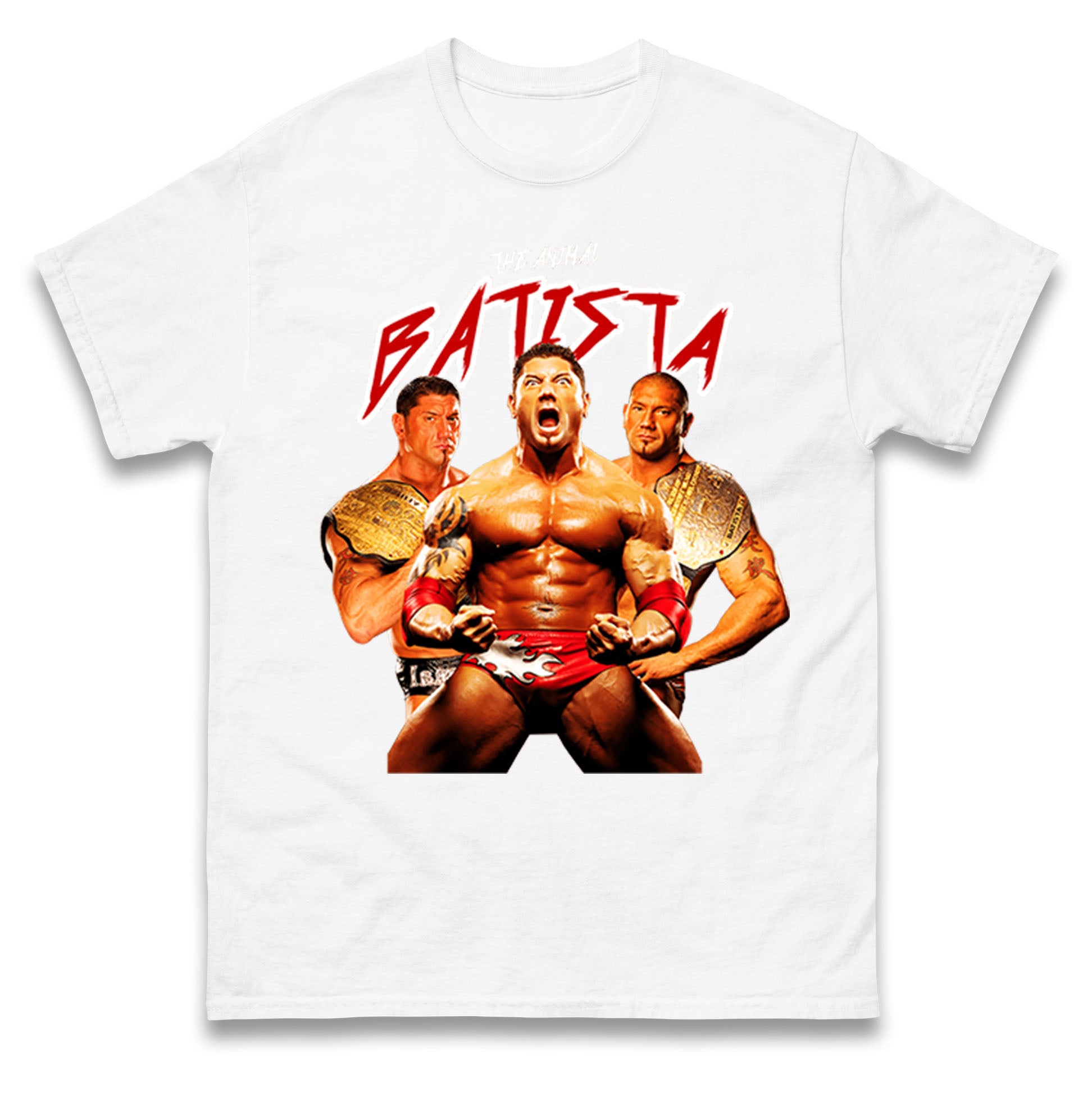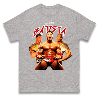 The Animal Batista Wrestling T Shirt is the perfect choice for fans of the legendary wrestler. Made with high-quality materials, it features a bold design that showcases Batista's signature animalistic style. Get ready to dominate the ring with confidence and style in this must-have shirt.