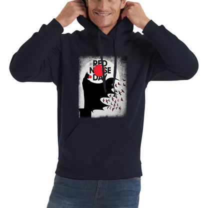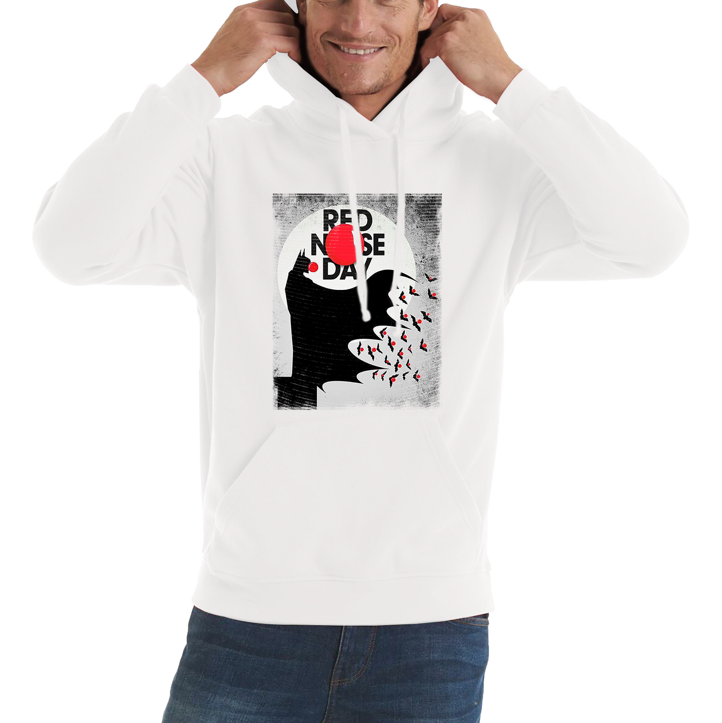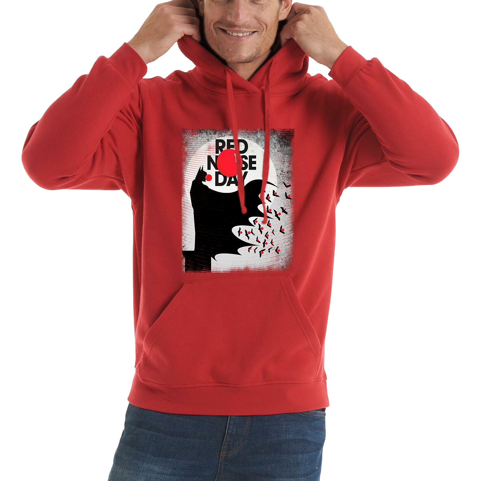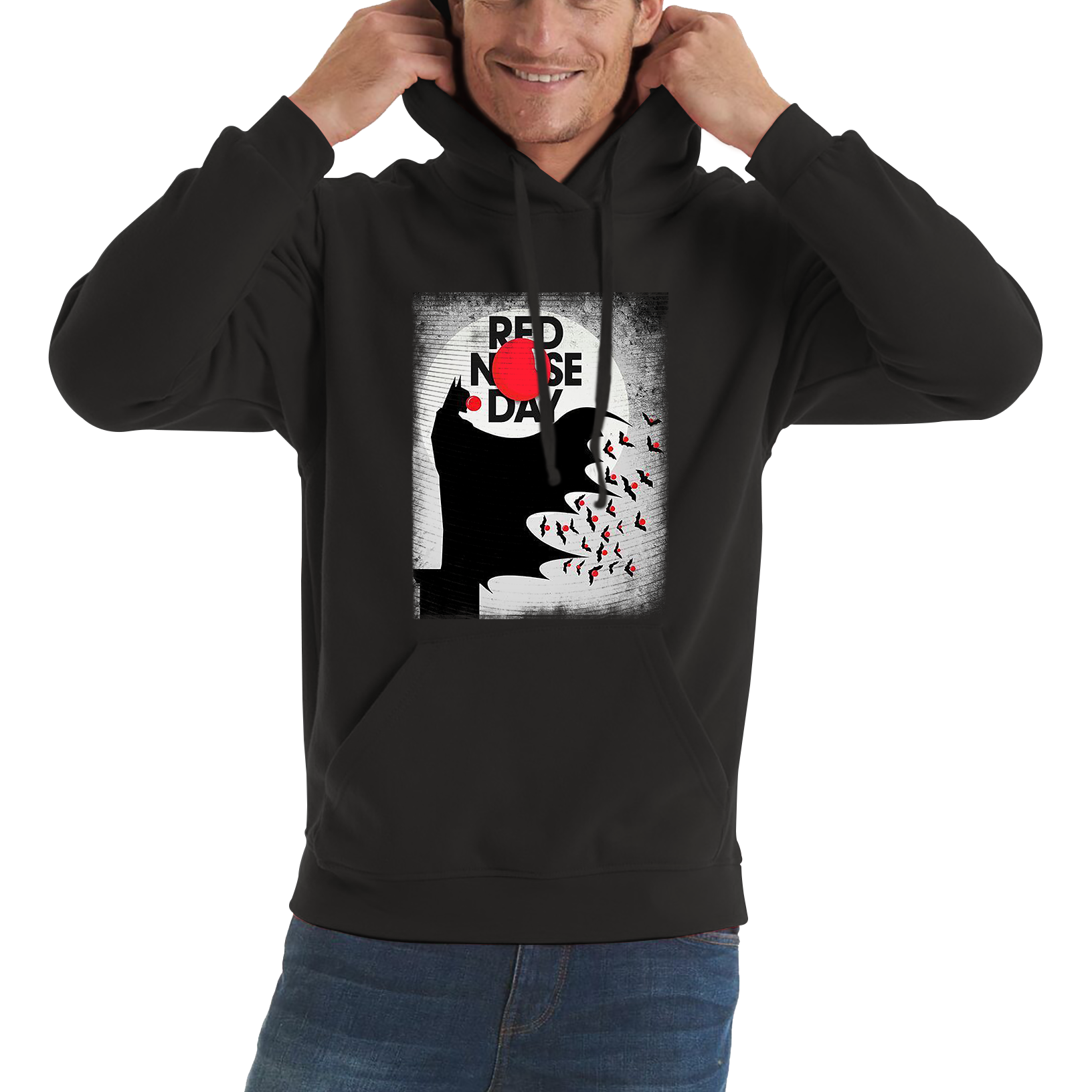 Stay cozy and show your support for a great cause with this Batman Red Nose Day Hoodie. Made with soft material, this hoodie features the iconic Batman logo and a red nose to promote the annual charity event. 10% of proceeds goes towards helping children in need.