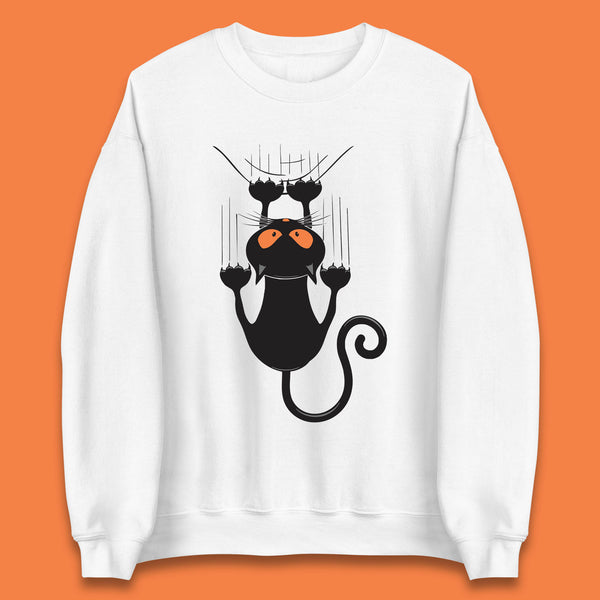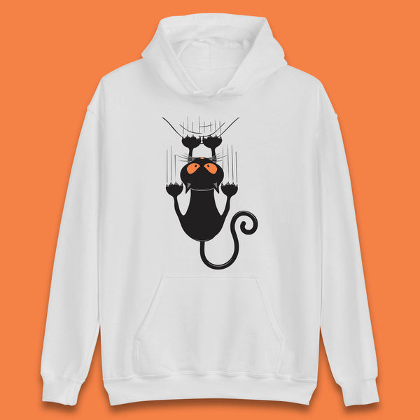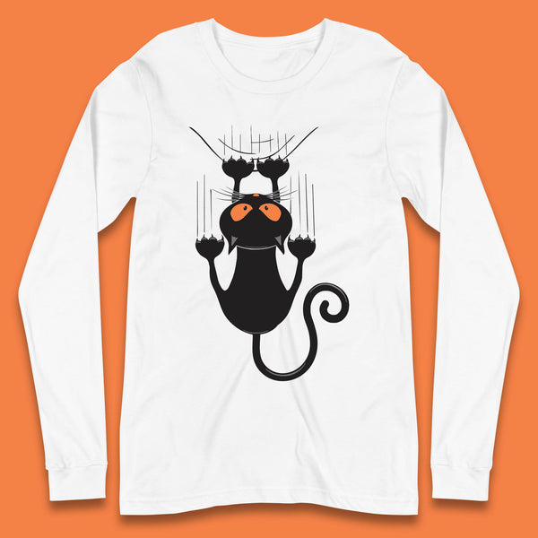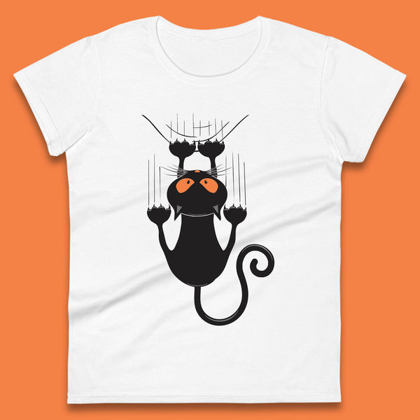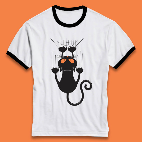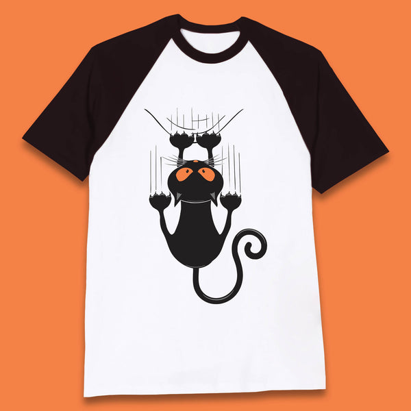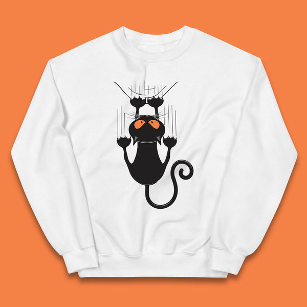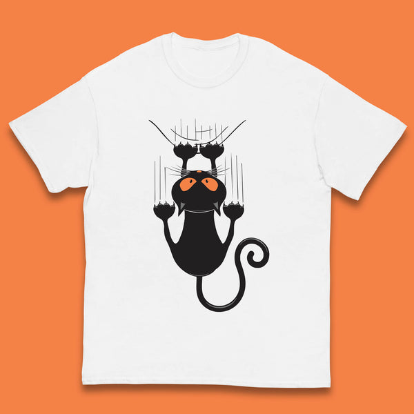 Black Cat Cartoon Scratching Climbing Wall Halloween Horror Scary Black Cat Spooky Season Kids T Shirt