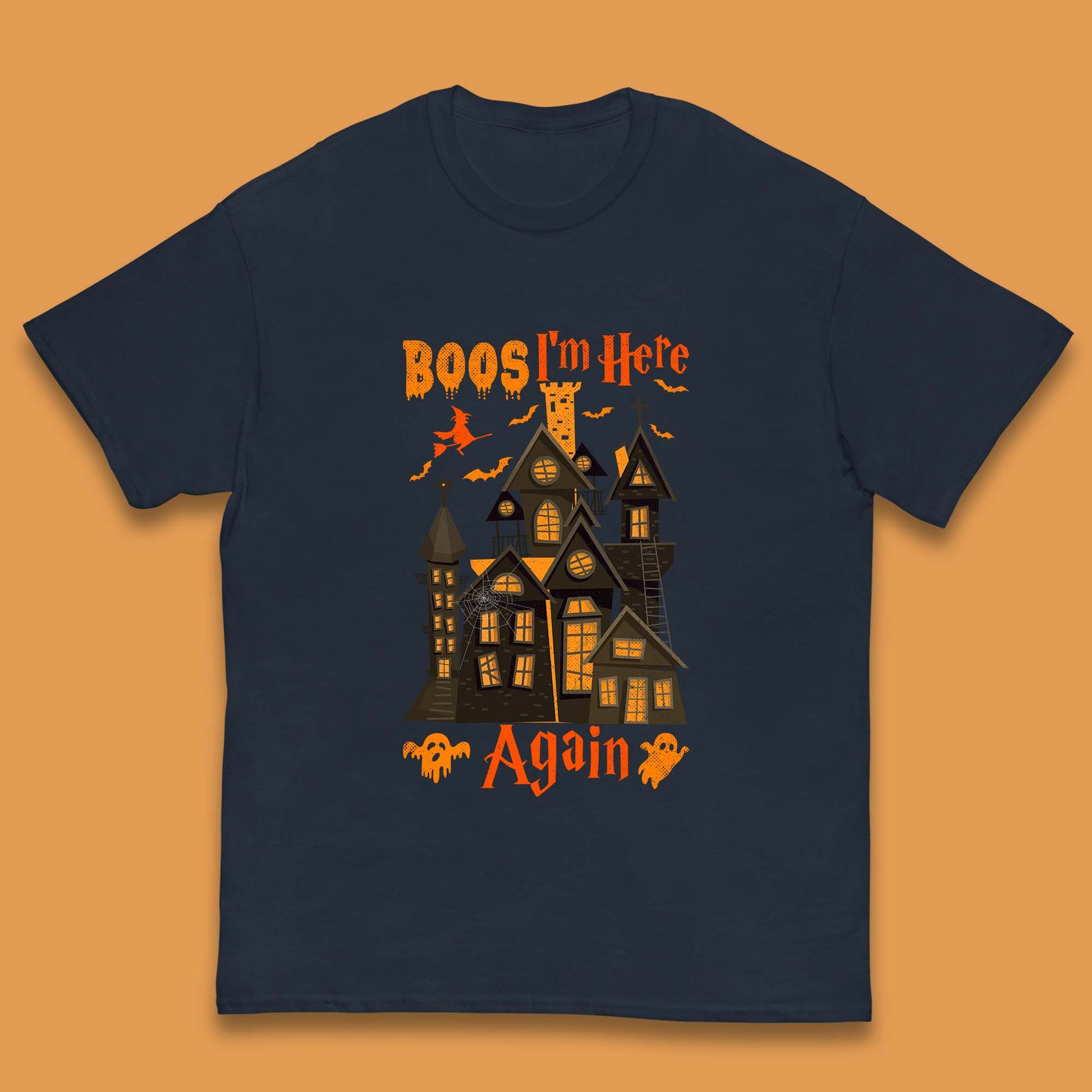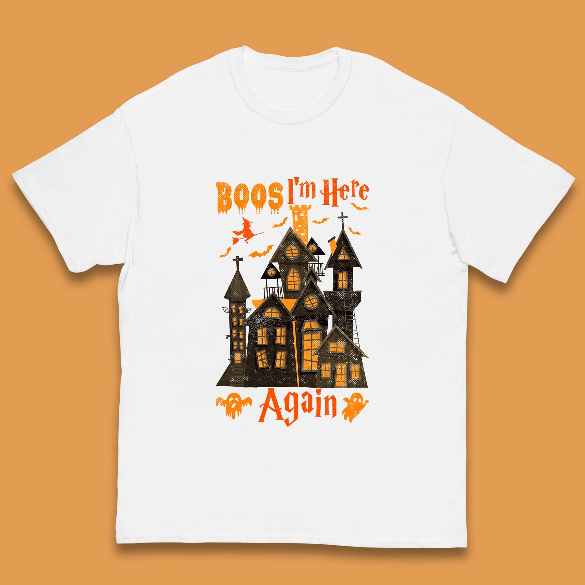 Boos I'm Here Again Halloween Haunted House Horror Scary Spooky Season Kids T Shirt