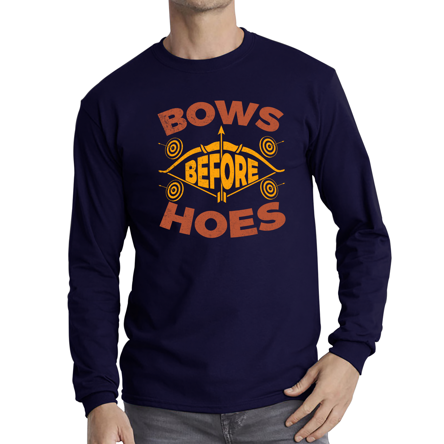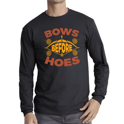 Embrace your passion for archery with the Bows Before Hoes Long Sleeve T-Shirt. This tee combines a bold, humorous statement with comfort, perfect for archers who want to show off their dedication to their favorite sport.