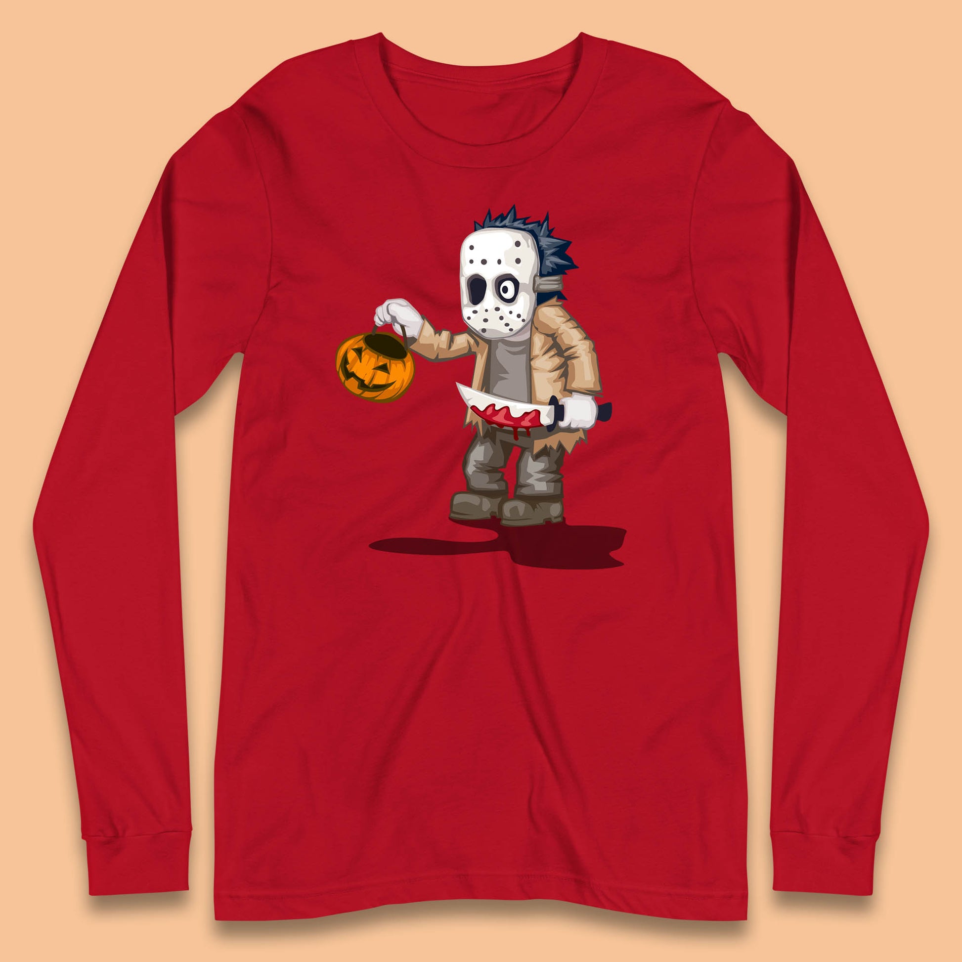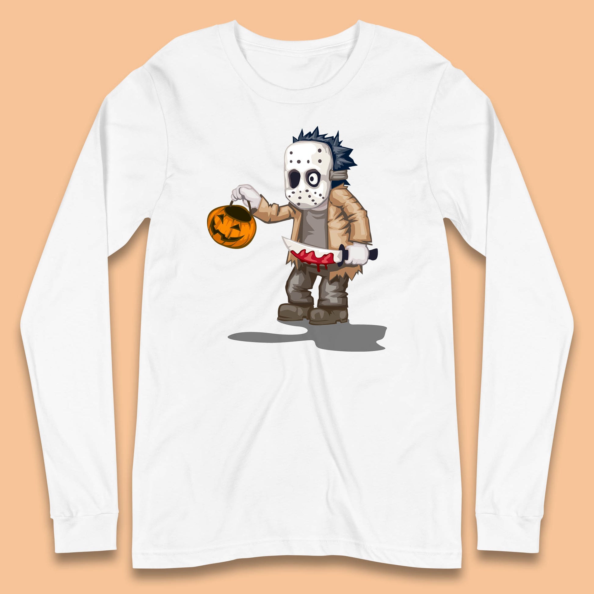 Chibi Jason Voorhees Holding Bloody Knife And Pumpkin Bucket Halloween Friday The 13th Horror Movie Long Sleeve T Shirt