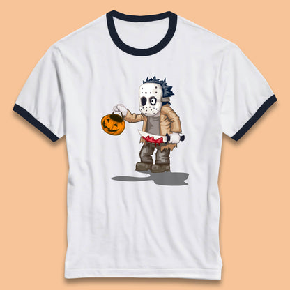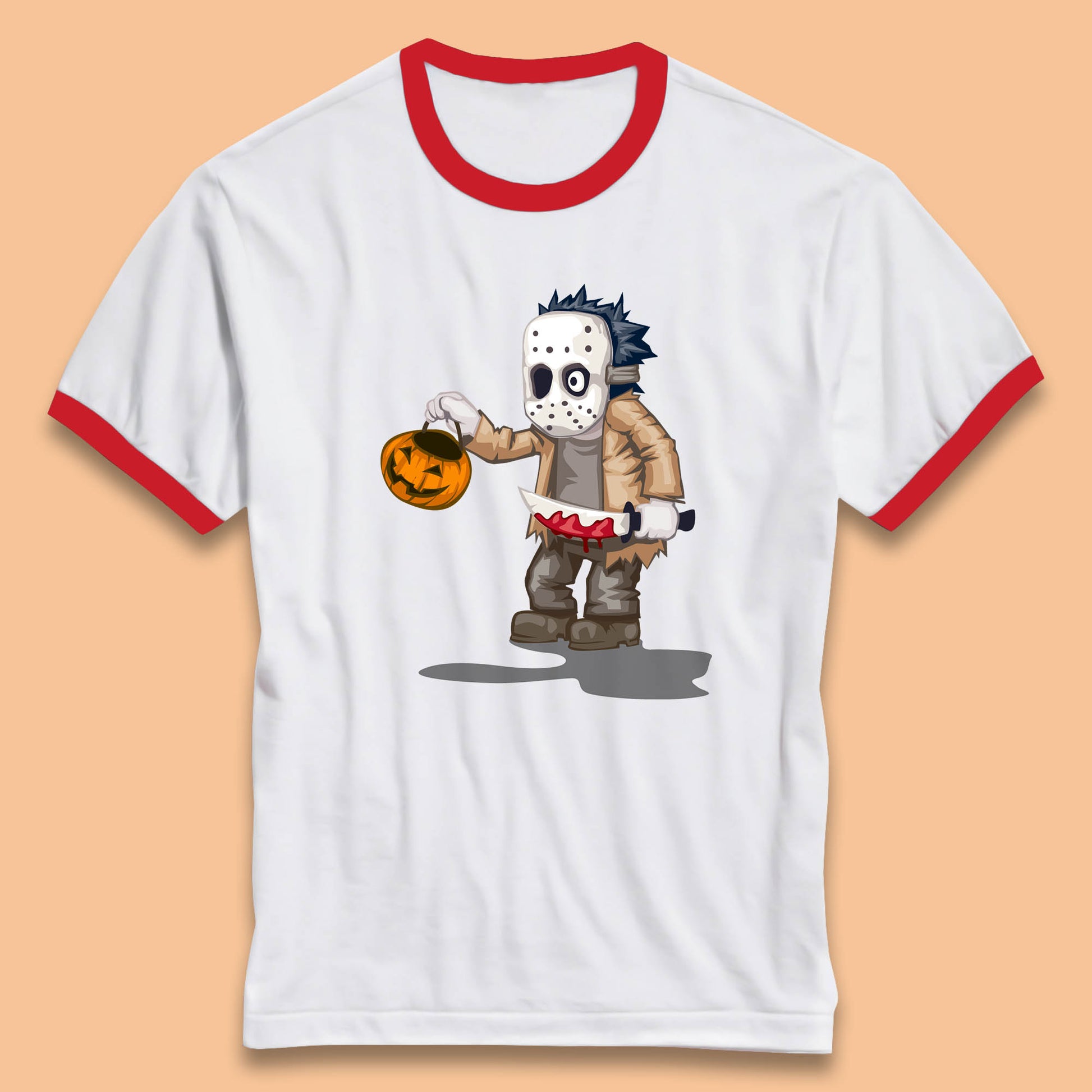Chibi Jason Voorhees Holding Bloody Knife And Pumpkin Bucket Halloween Friday The 13th Horror Movie Ringer T Shirt