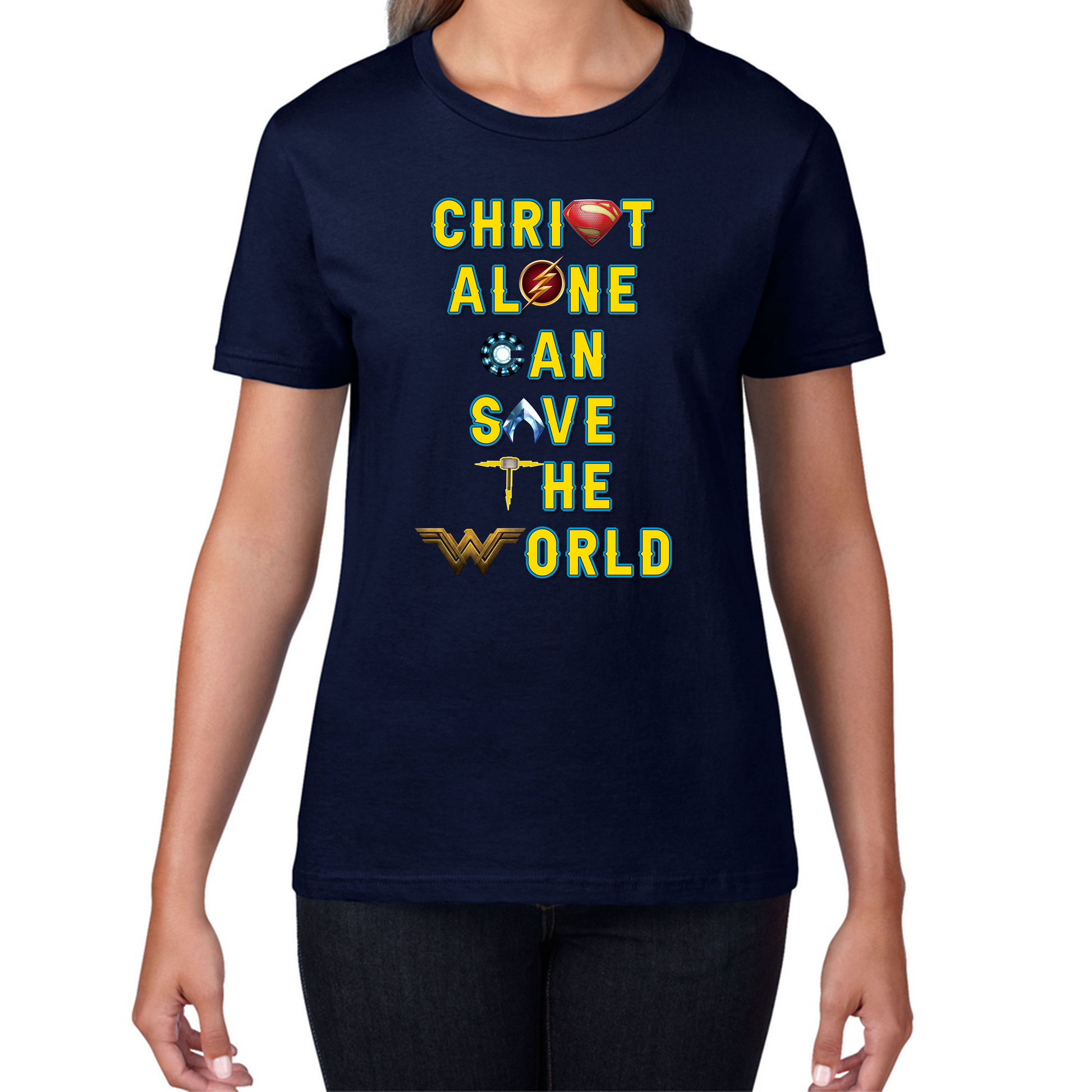 Showcase your faith with the "Christ Alone Can Save The World" ladies' T-shirt. This shirt features a profound and uplifting message, making it perfect for women who wish to express their beliefs with style and grace. Ideal for casual wear, church events, or spiritual gatherings, it combines a meaningful design with a flattering fit.