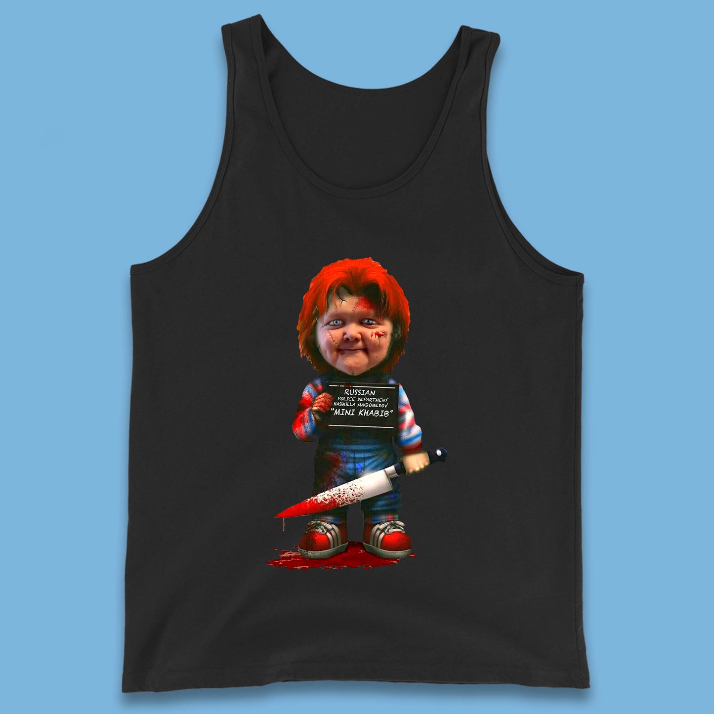 Chucky Mug Shot Russian Police Dept Hasbulla Magomedov Chucky Mini Khabib Inspired Halloween Horror Movie Good Guy Chucky Tank Top