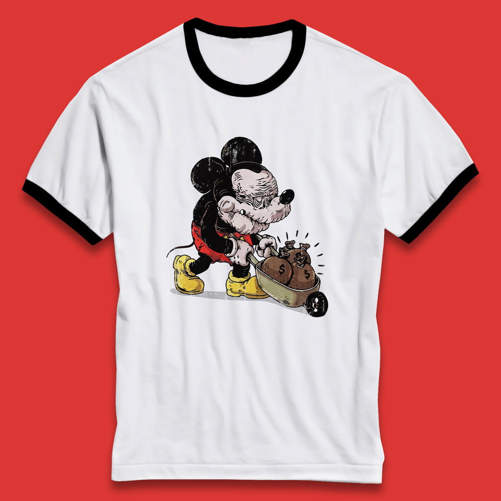 Disney Famous Oldies Mickey Mouse Pull Wheelbarrow Full Of Money Bags Cartoon Character Disney World Ringer T Shirt