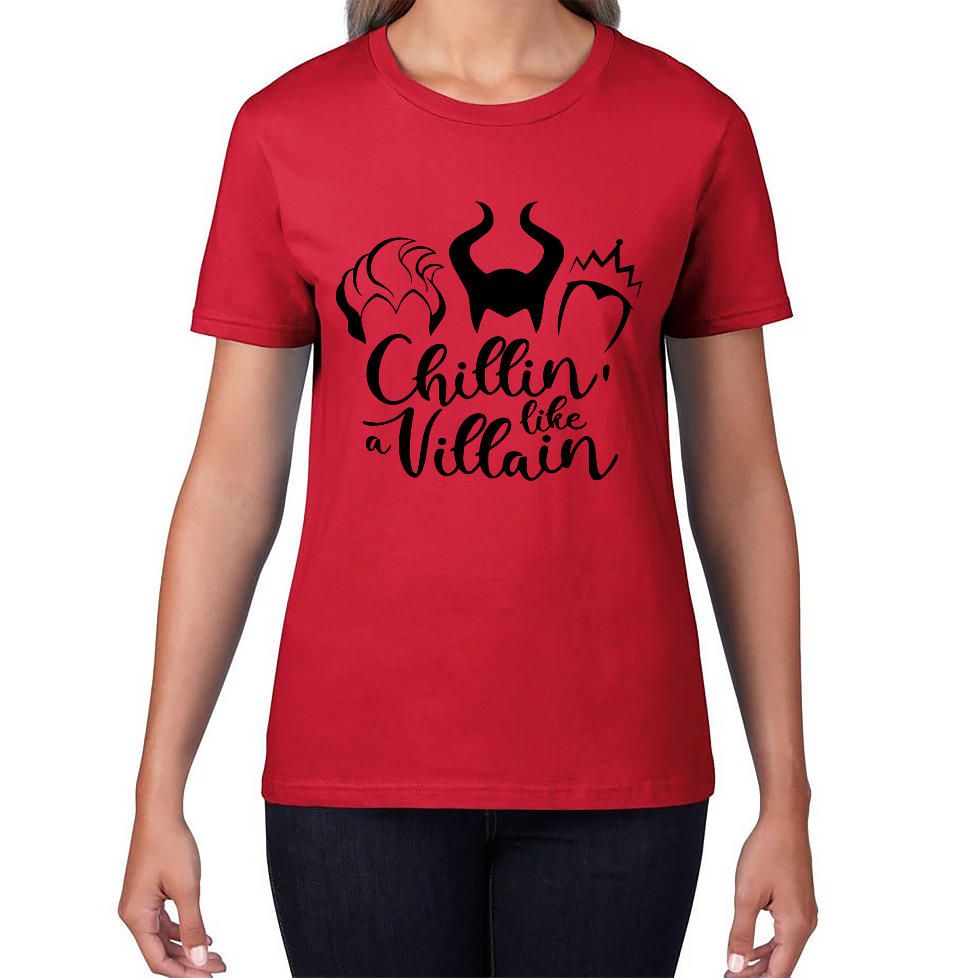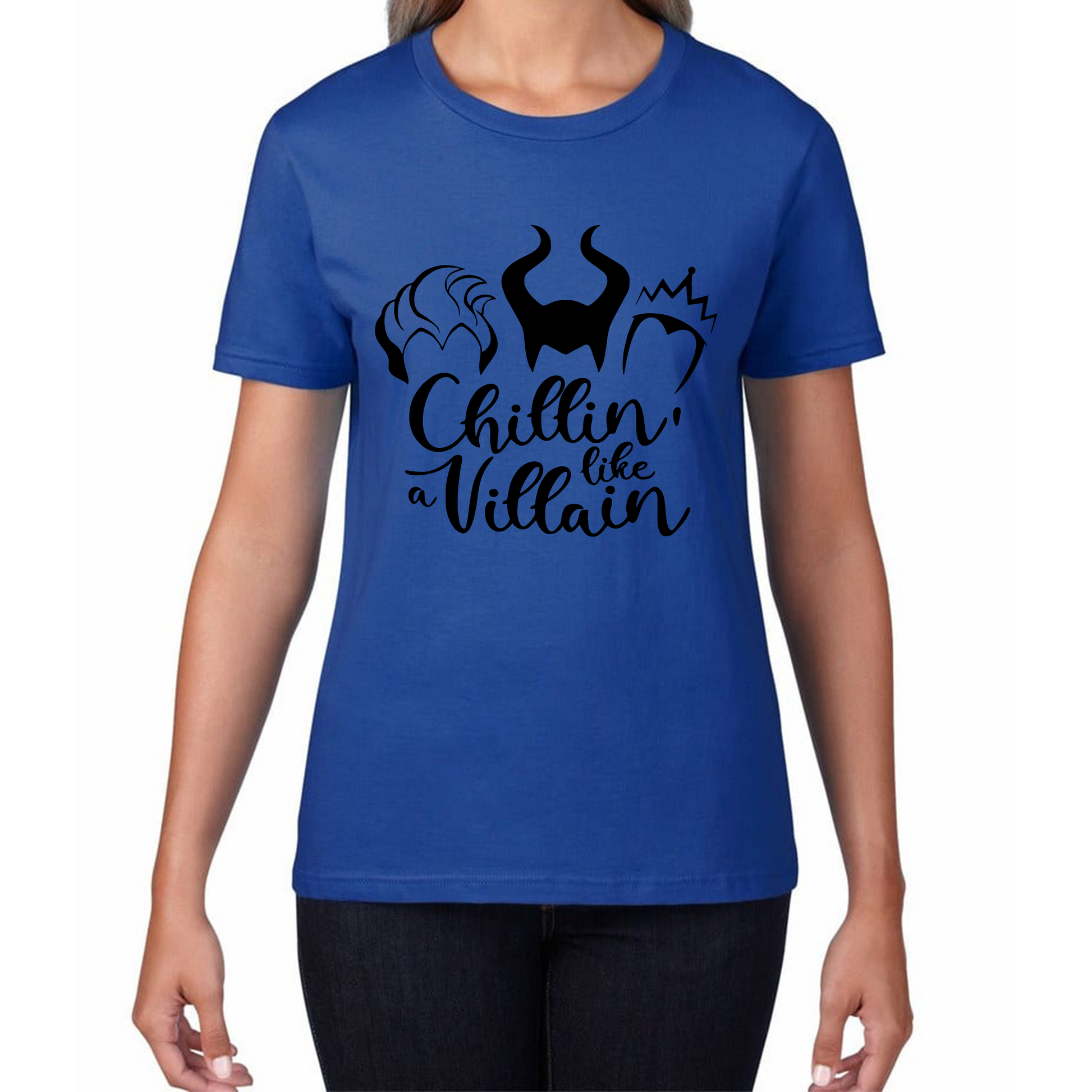 Embrace your inner villain with the Chillin' Like A Villain Sanderson Sisters Ladies T-Shirt. This stylish tee combines a playful design with flattering fit and comfort, making it a perfect choice for fans of Disney’s iconic Maleficent Sisters.