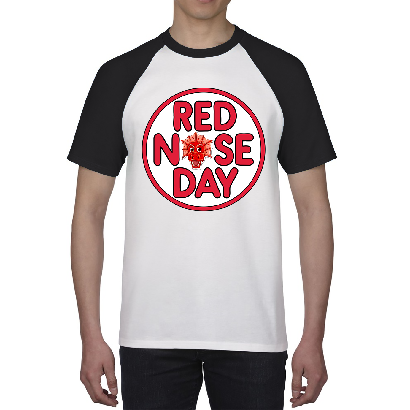 Dragon Face Red Nose Day Baseball T Shirt. 50% Goes To Charity