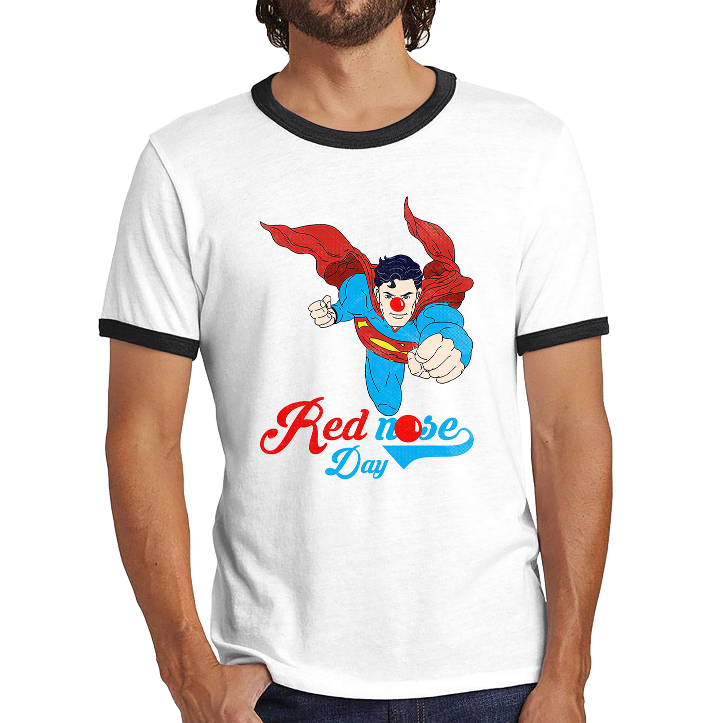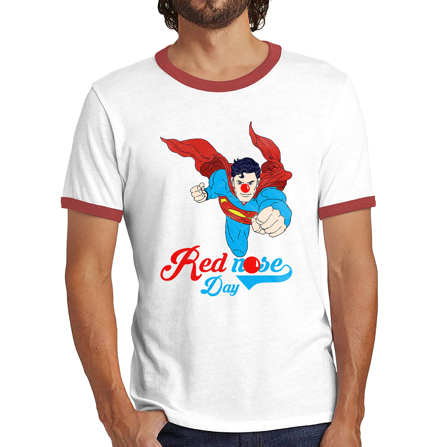 Flying Superman Red Nose Day Comic Superhero Ringer T Shirt. 50% Goes To Charity