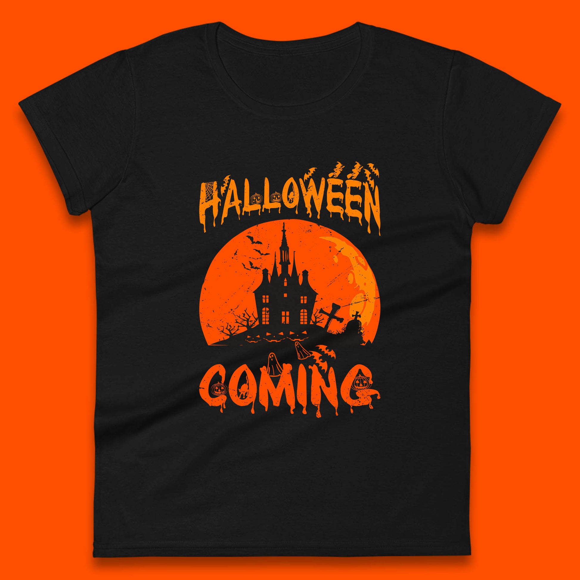 Halloween Coming Horror Scary Ghost Haunted House Spooky Season Womens Tee Top