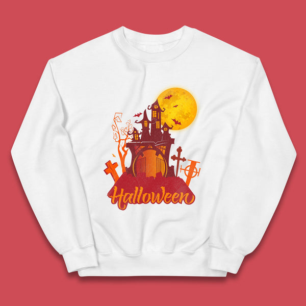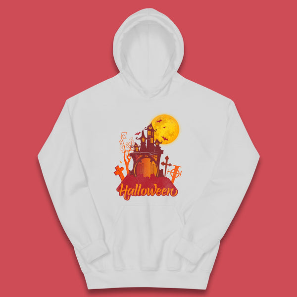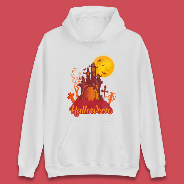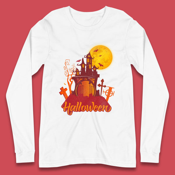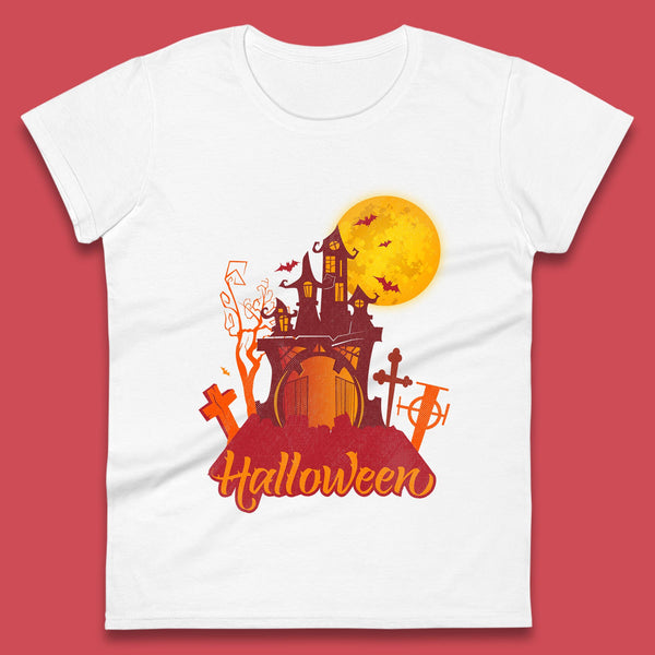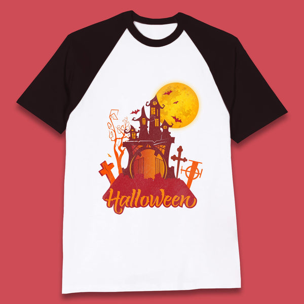 Halloween Lettering With Full Moon Scary Haunted House Flying Bats Horror Graveyard Mens Tee Top
