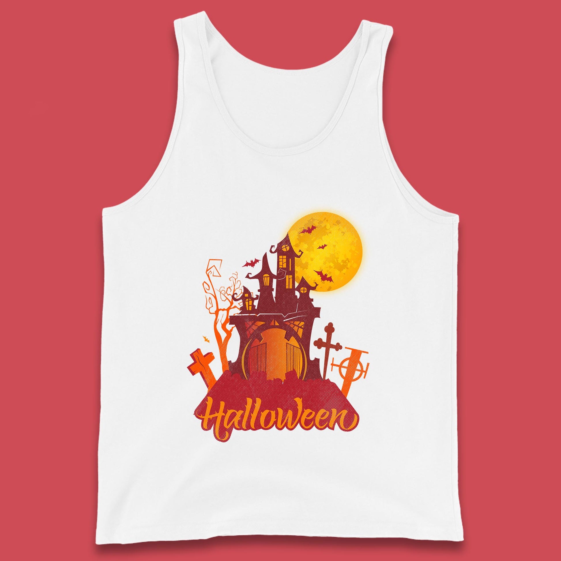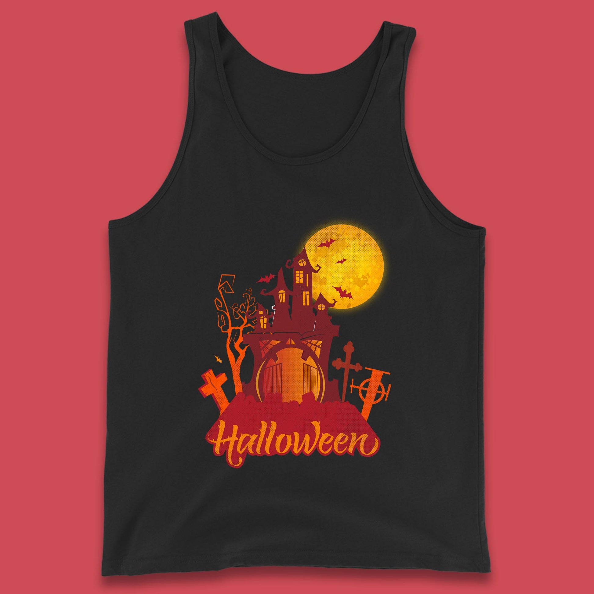 Halloween Lettering With Full Moon Scary Haunted House Flying Bats Horror Graveyard Tank Top