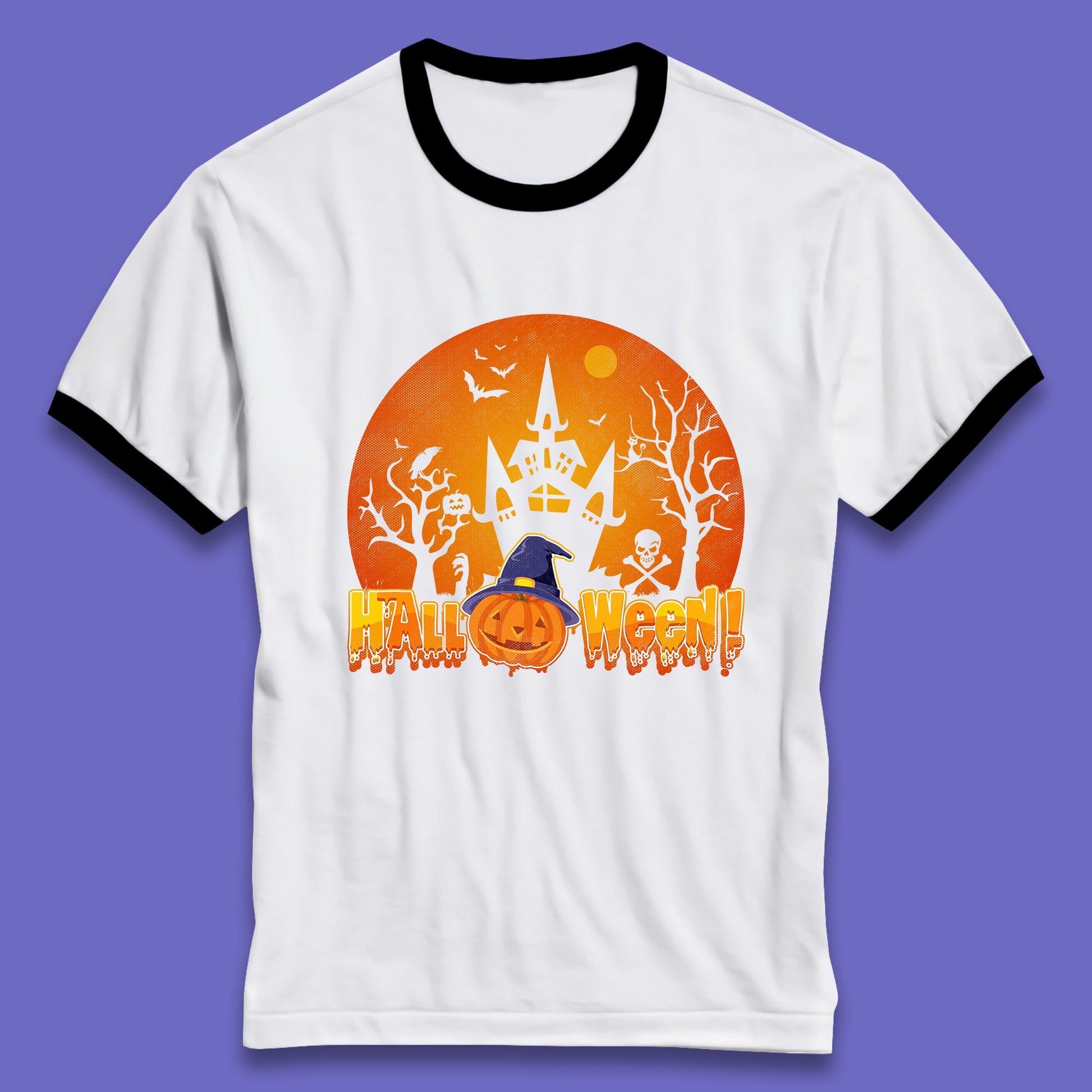 Halloween Pumpkin Witch Hat Haunted Castle Flying Bats Skull Bones Scary Dark Night Ringer T Shirt