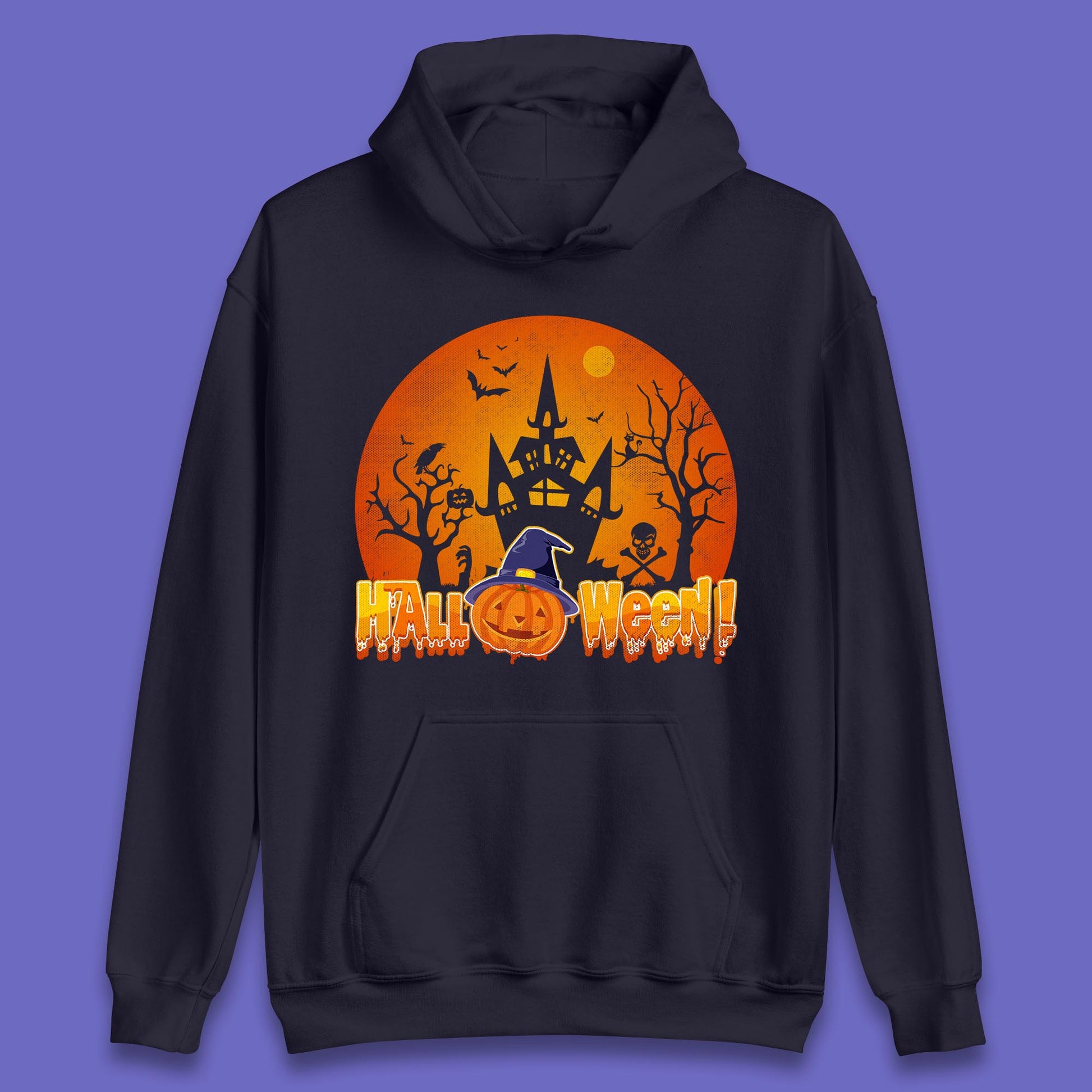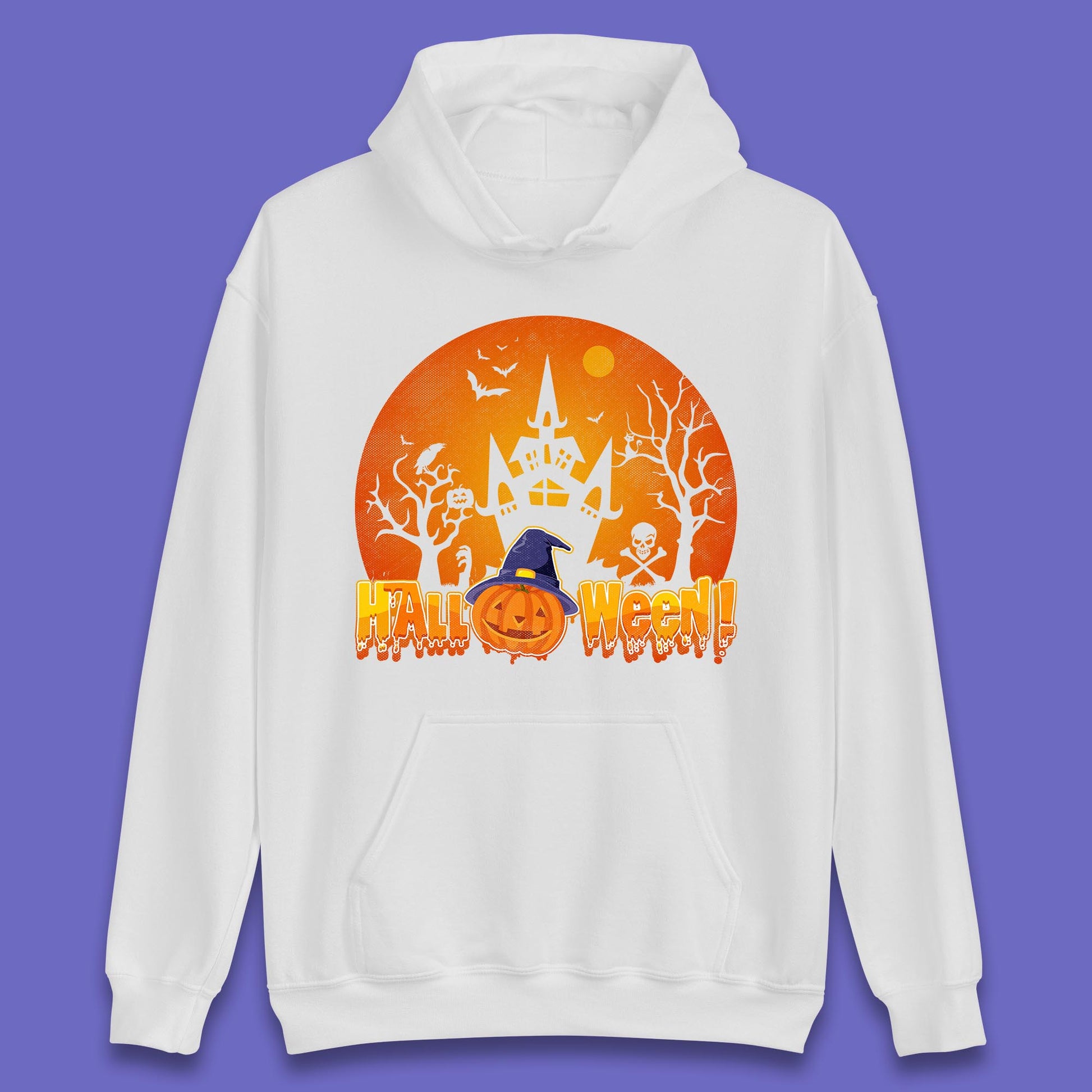 Halloween Pumpkin Witch Hat Haunted Castle Flying Bats Skull Bones Scary Dark Night Unisex Hoodie