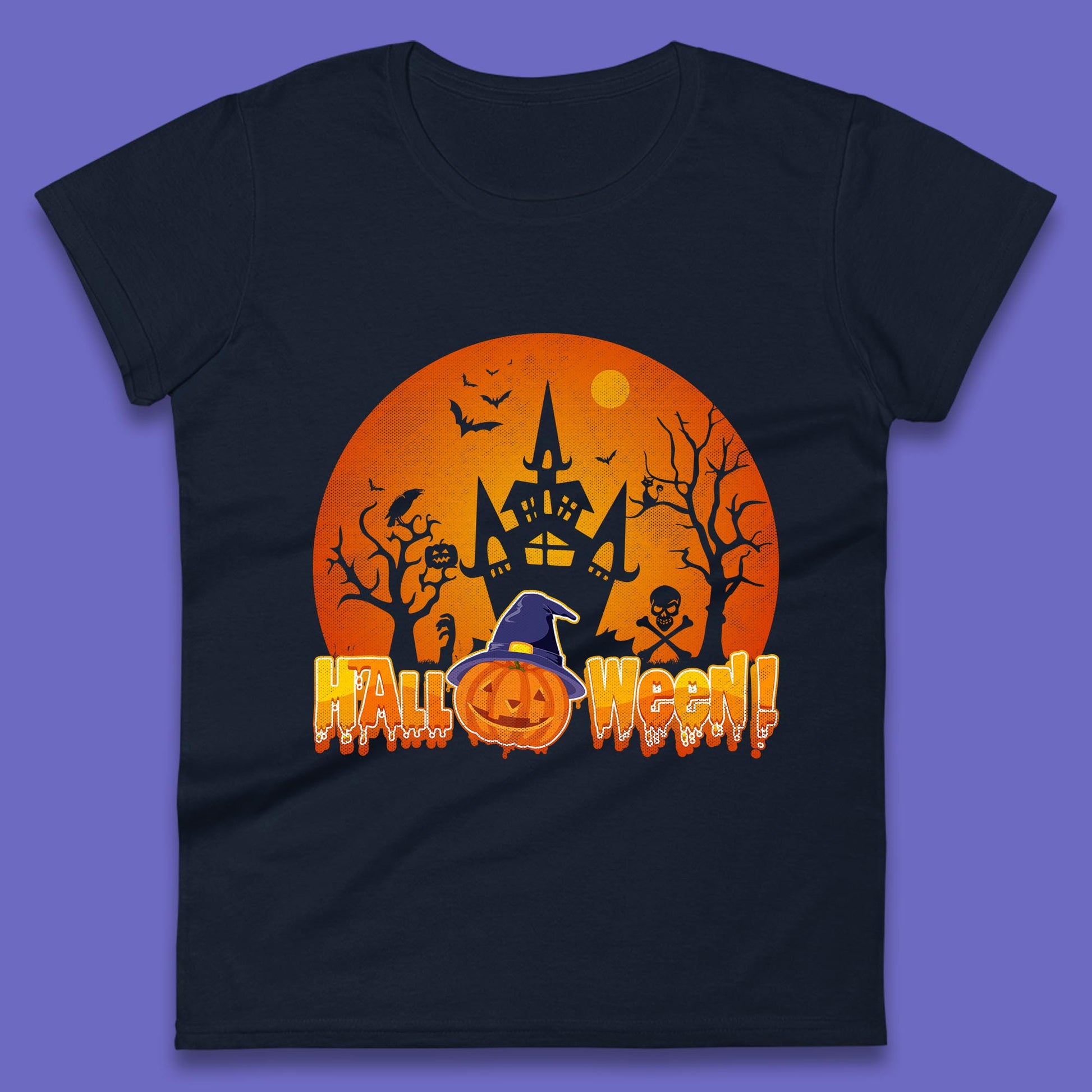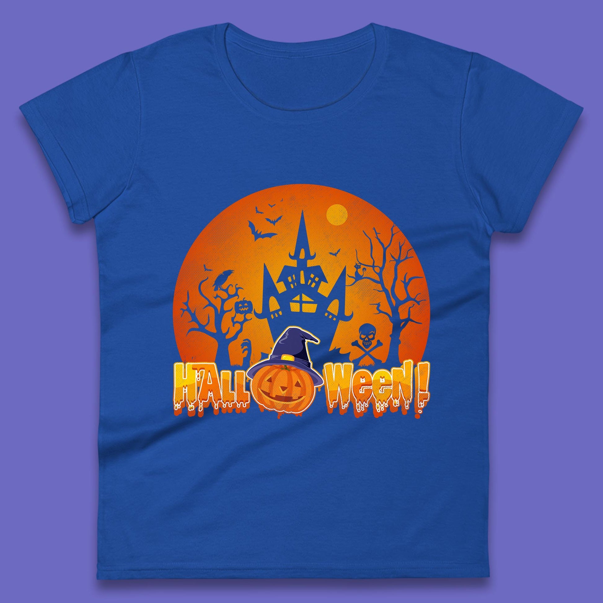 Halloween Pumpkin Witch Hat Haunted Castle Flying Bats Skull Bones Scary Dark Night Womens Tee Top