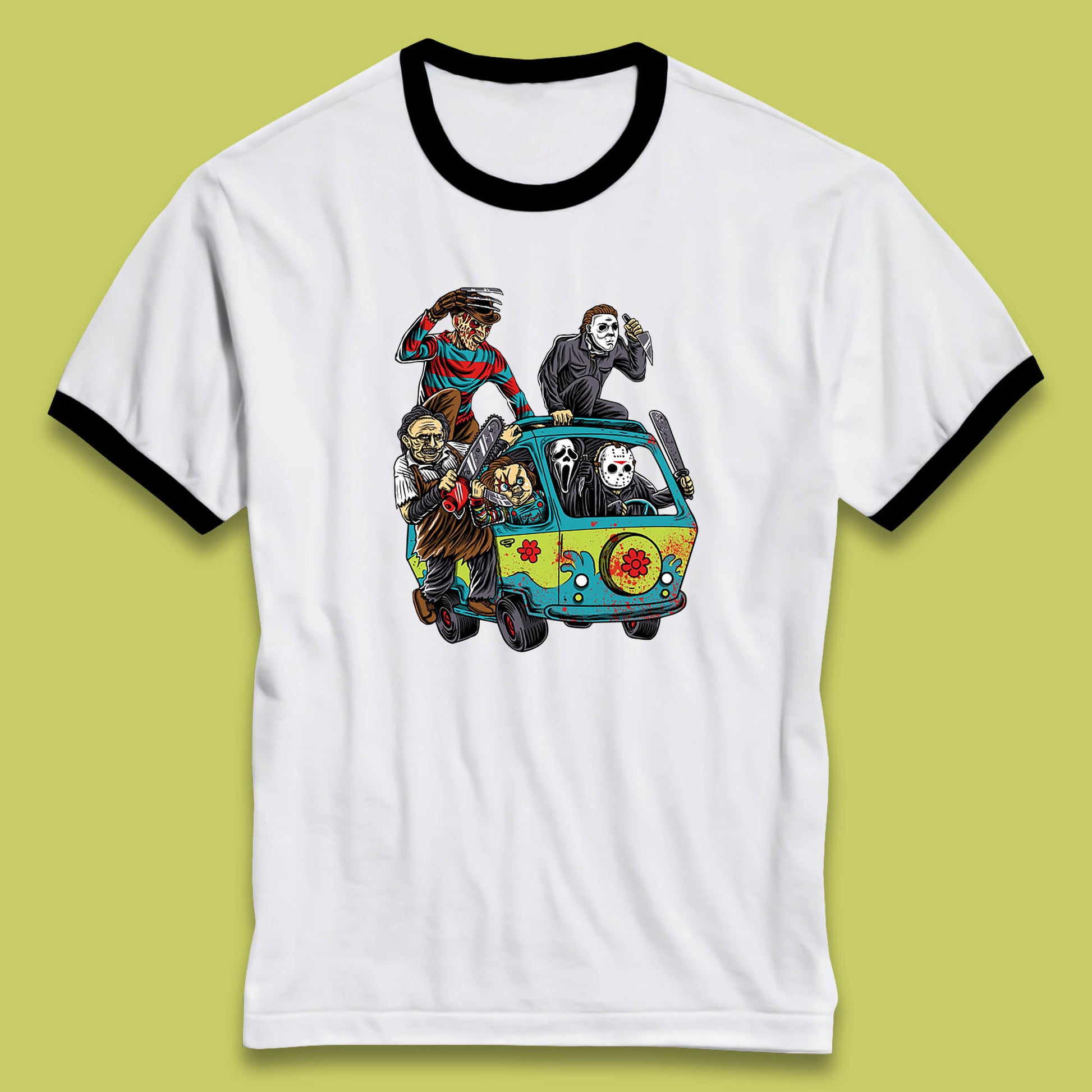Halloween Scooby Doo Friends Van Horror Movie Villians Characters Mystery Machine Ringer T Shirt
