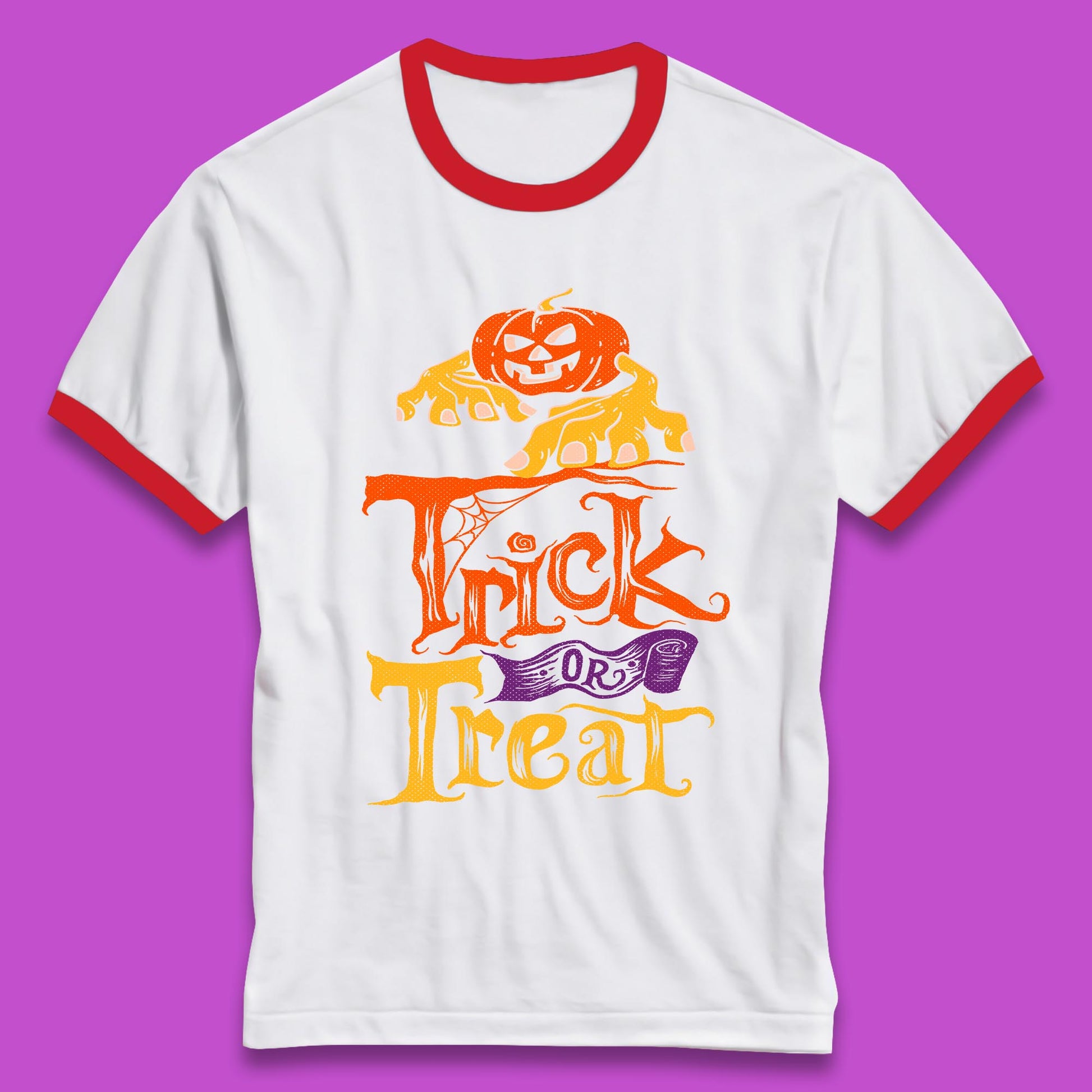 Halloween Trick Or Treat Horror Scary Evil Pumpkin With Zombie Hands Ringer T Shirt