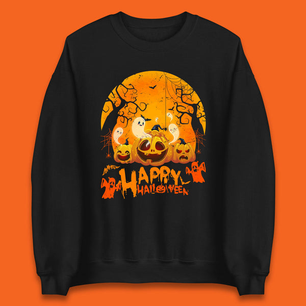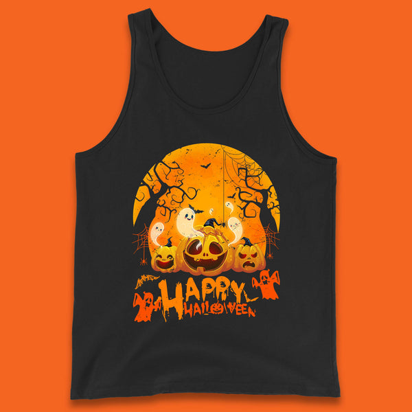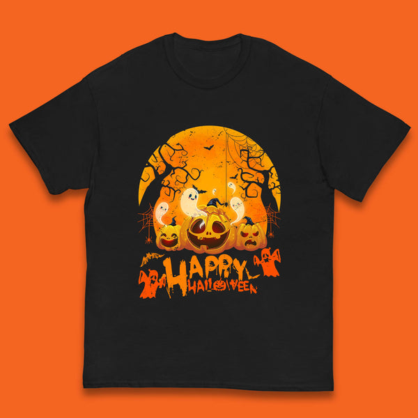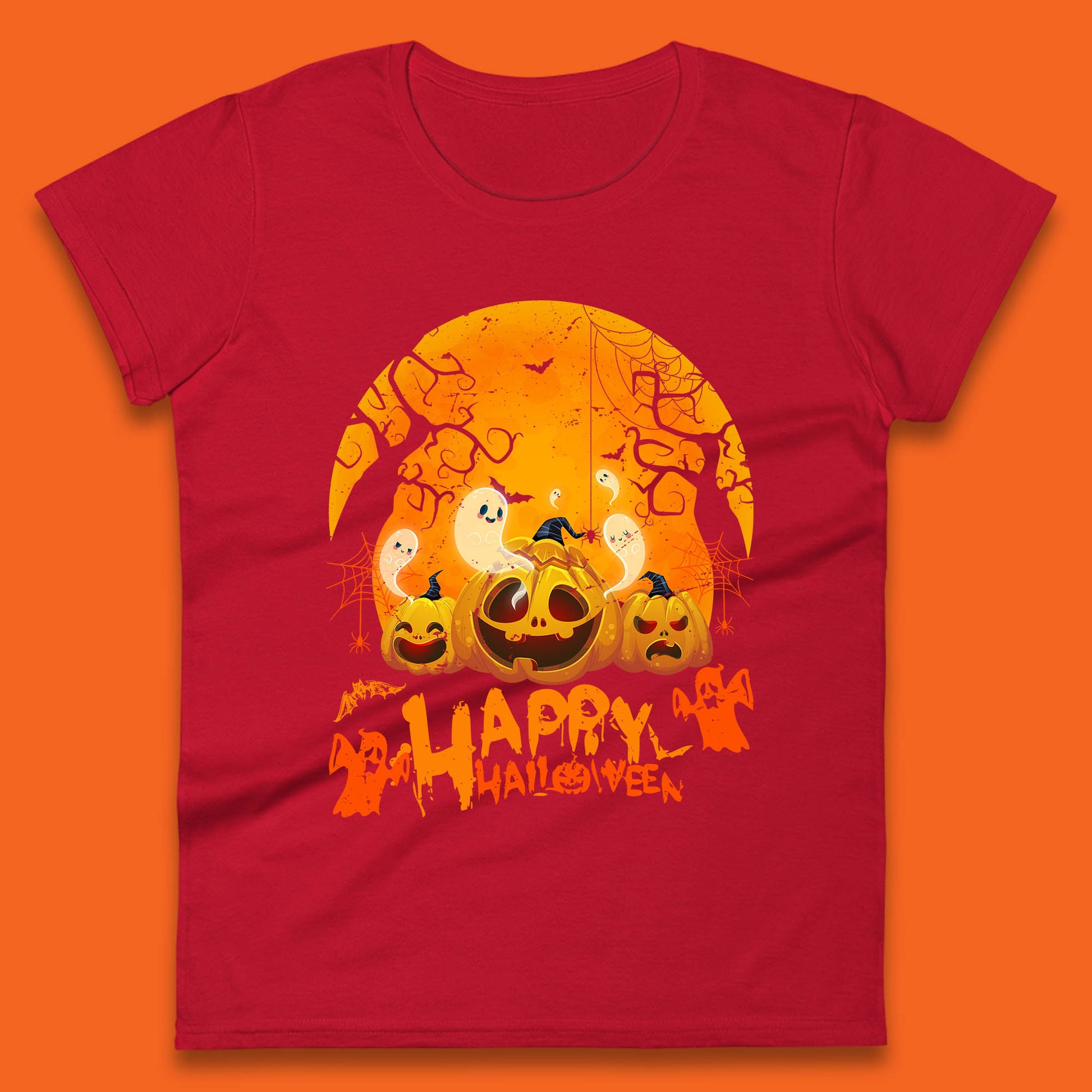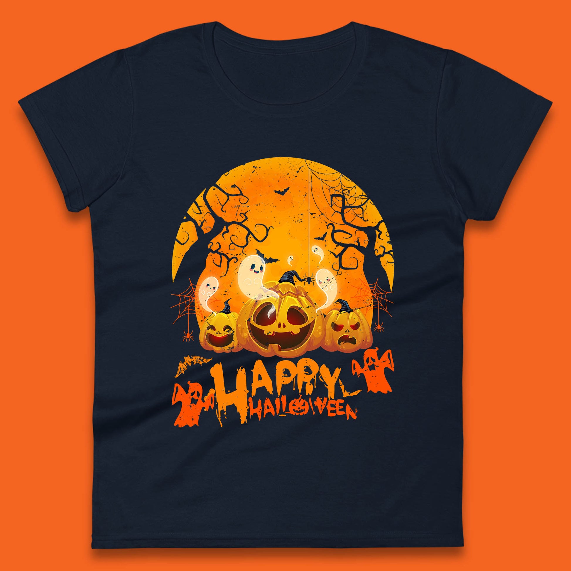 Happy Halloween Jack O Lantern Pumpkins Scary Boo Ghost Haunted Trees Womens Tee Top