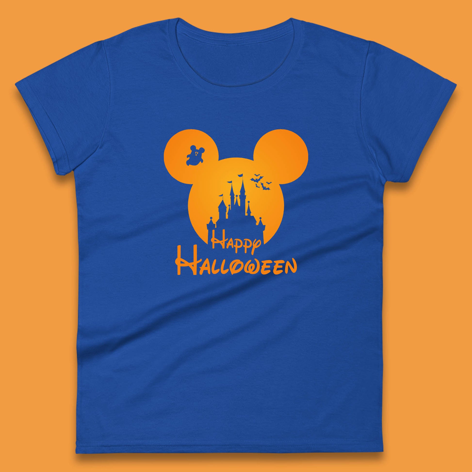 Happy Halloween Mickey Mouse Disney Castle Halloween Scary Boo Flying Bats Womens Tee Top
