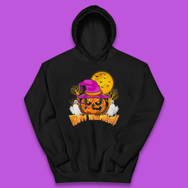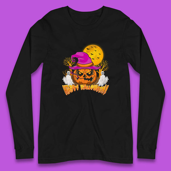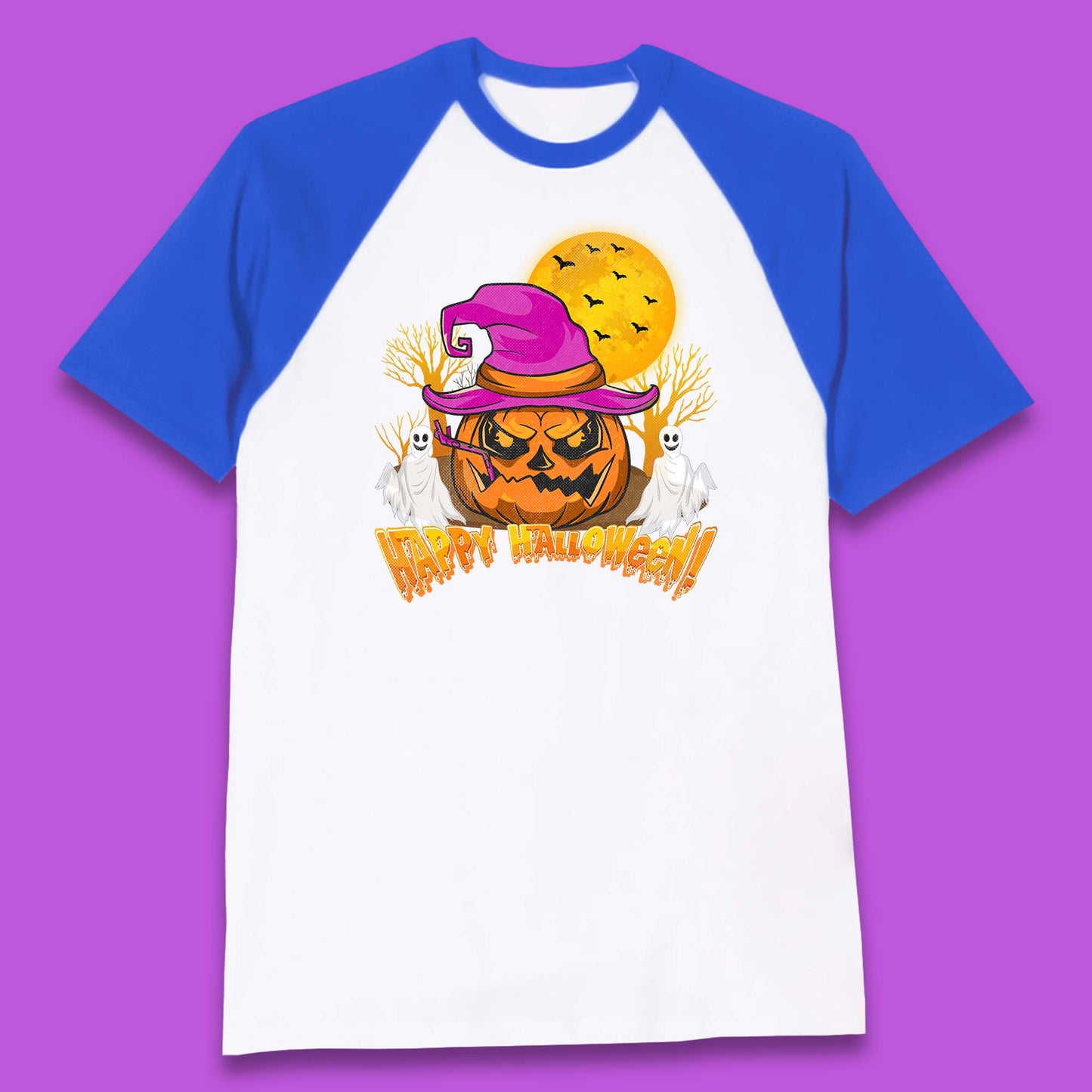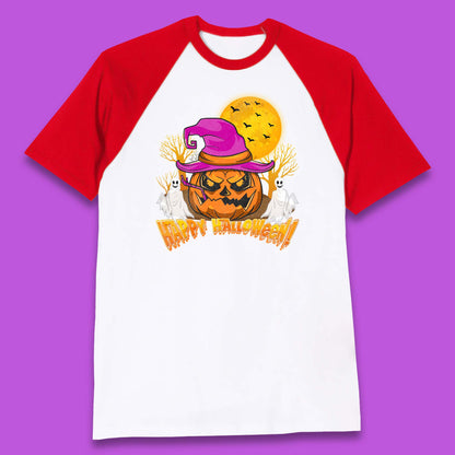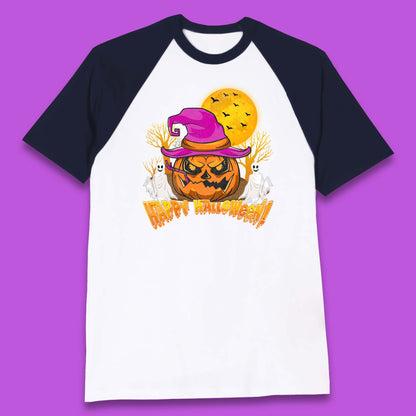 Happy Halloween Pumpkin Witch Hat Jack-o'-lantern With Full Moon Flying Bats Horror Scary Boo Ghost Baseball T Shirt