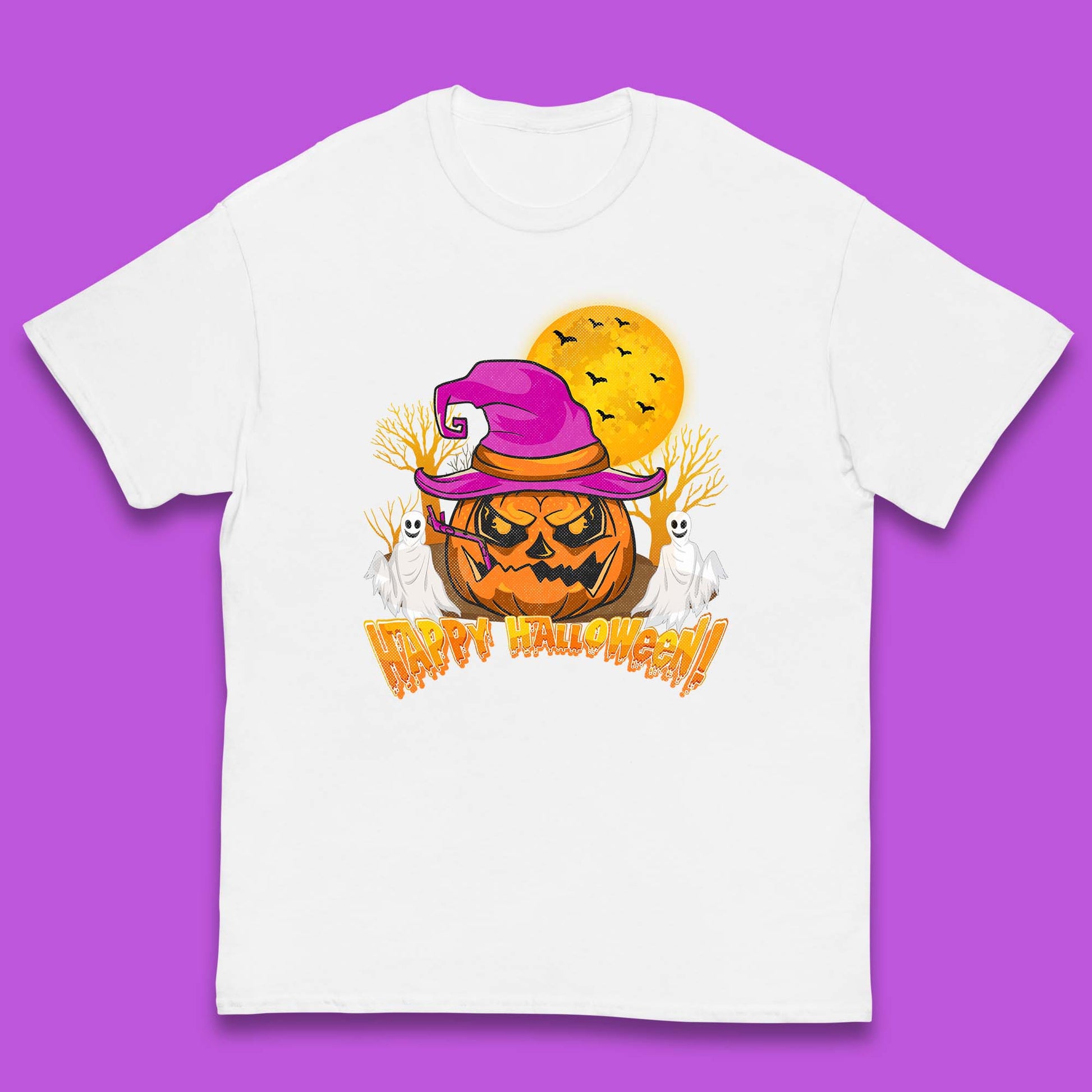 Happy Halloween Pumpkin Witch Hat Jack-o'-lantern With Full Moon Flying Bats Horror Scary Boo Ghost Kids T Shirt