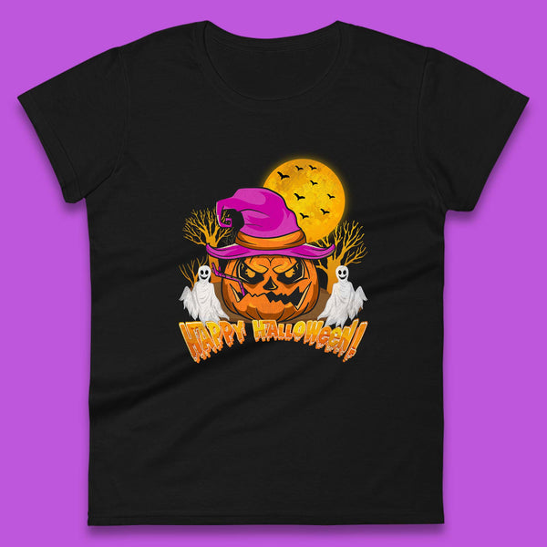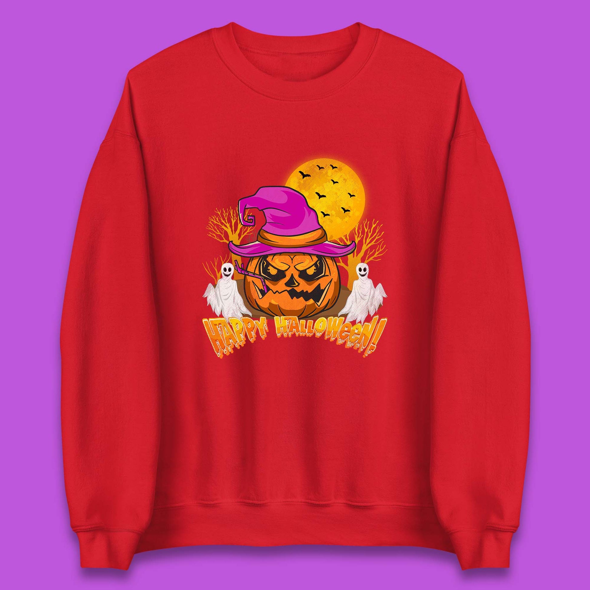 Happy Halloween Pumpkin Witch Hat Jack-o'-lantern With Full Moon Flying Bats Horror Scary Boo Ghost Unisex Sweatshirt
