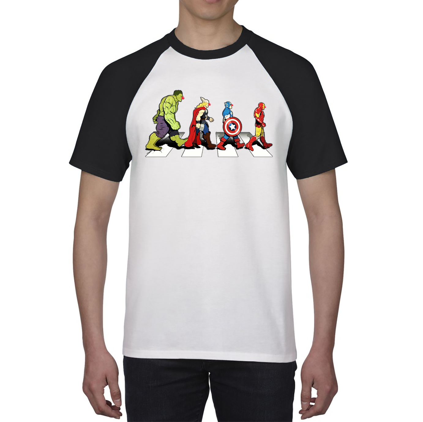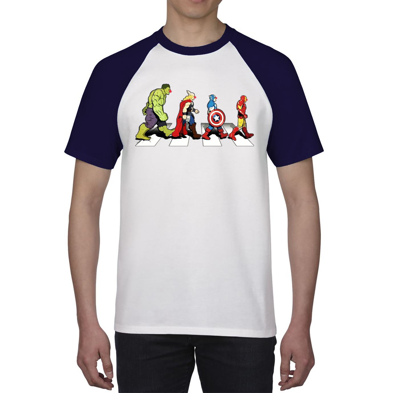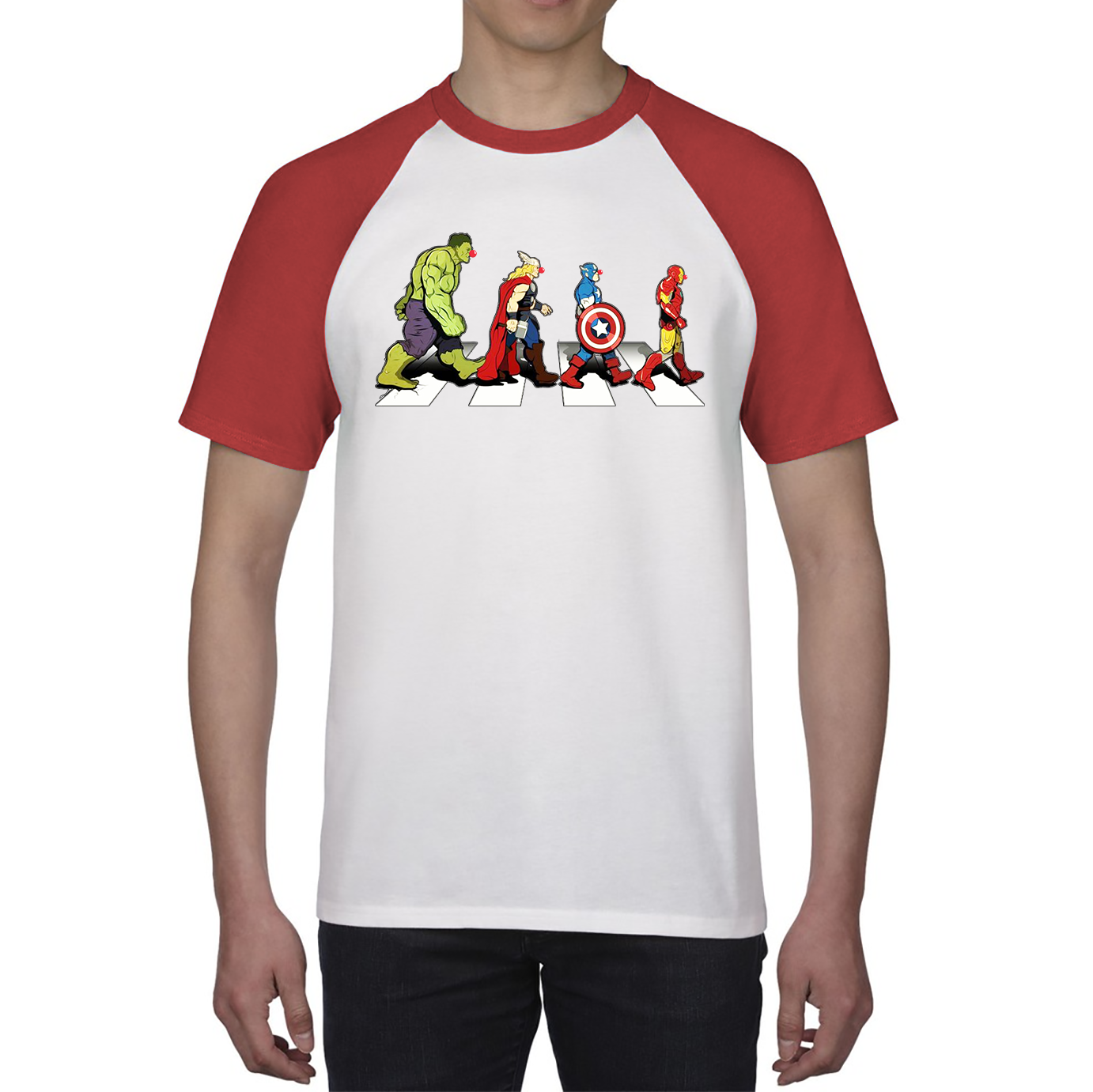 Hulk Thor Captain America Iron Man Marvel Avengers Abbey Road Red Nose Day Baseball T Shirt. 50% Goes To Charity