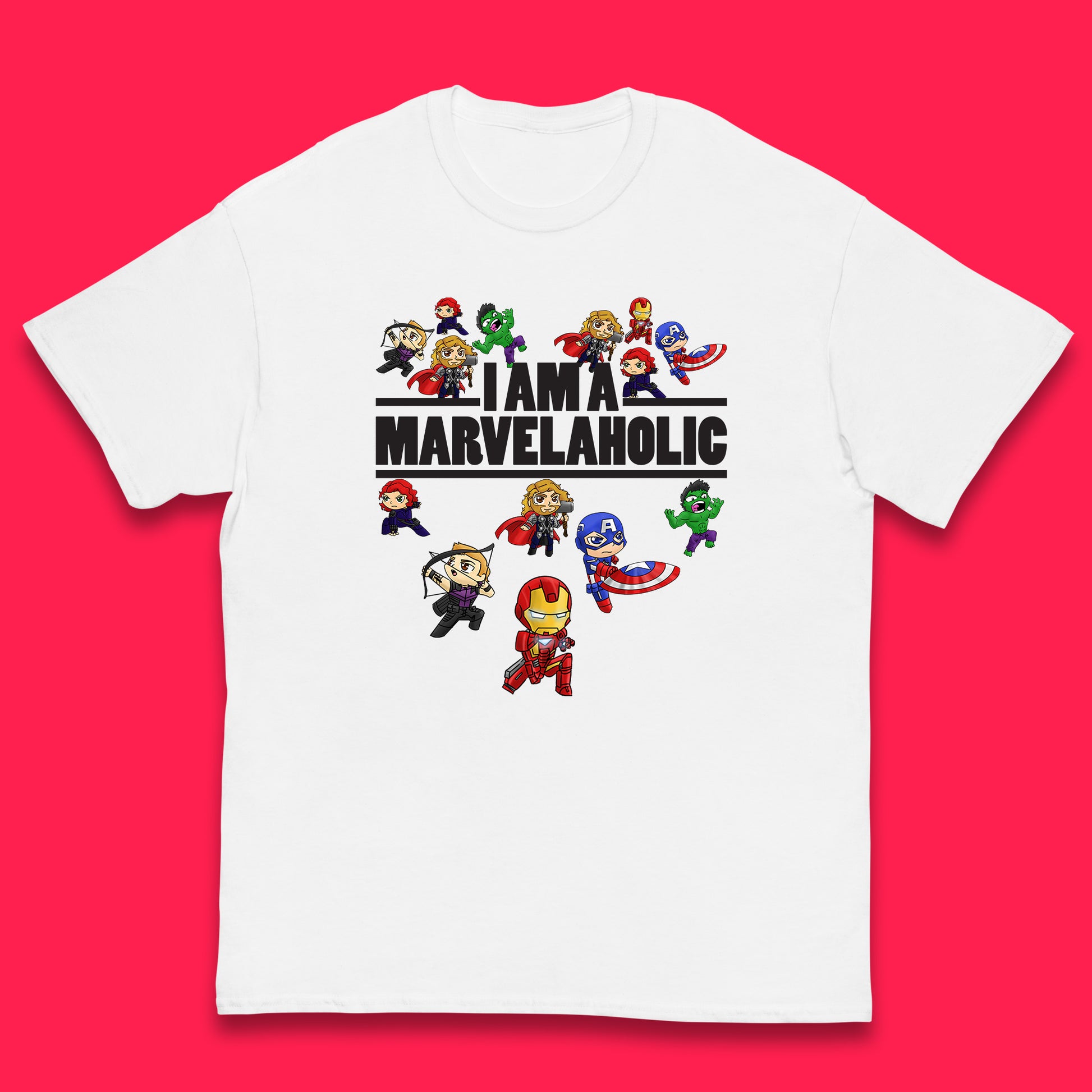 I Am A Marvelaholic Marvel Avengers Super Heroes Movie Characters Black Widow, Hulk, Iron Man, Thor, Captain America Kids T Shirt