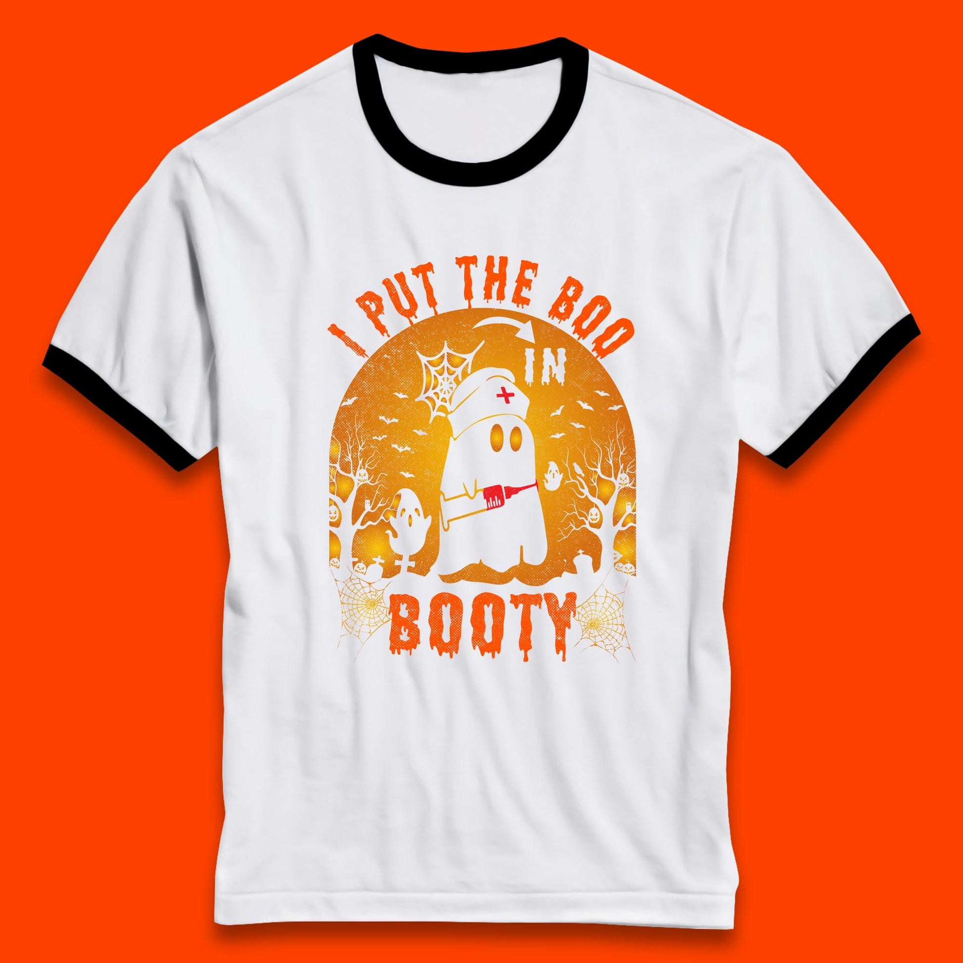 I Put The Boo In Booty Nurse Ghost Syringe Funny Halloween Nursing Boo Ghost Costume Ringer T Shirt