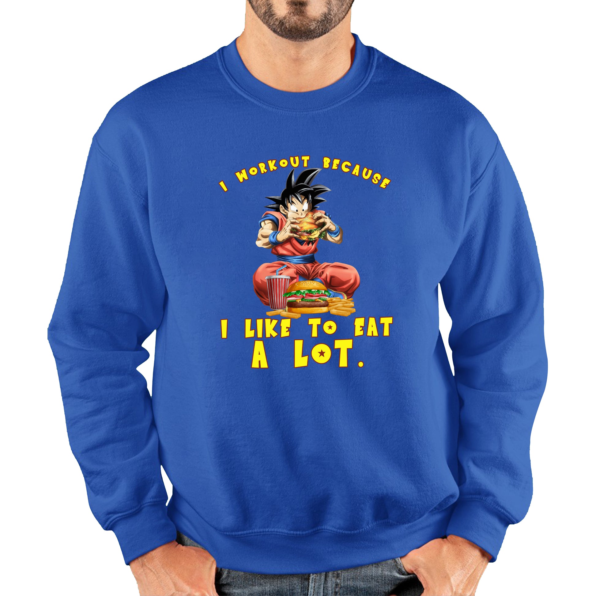 I Workout Because I Like To Eat A Lot Goku Eating A Hamburger Dragon Ball Anime Gym Bodybuilding Workout Unisex Sweatshirt