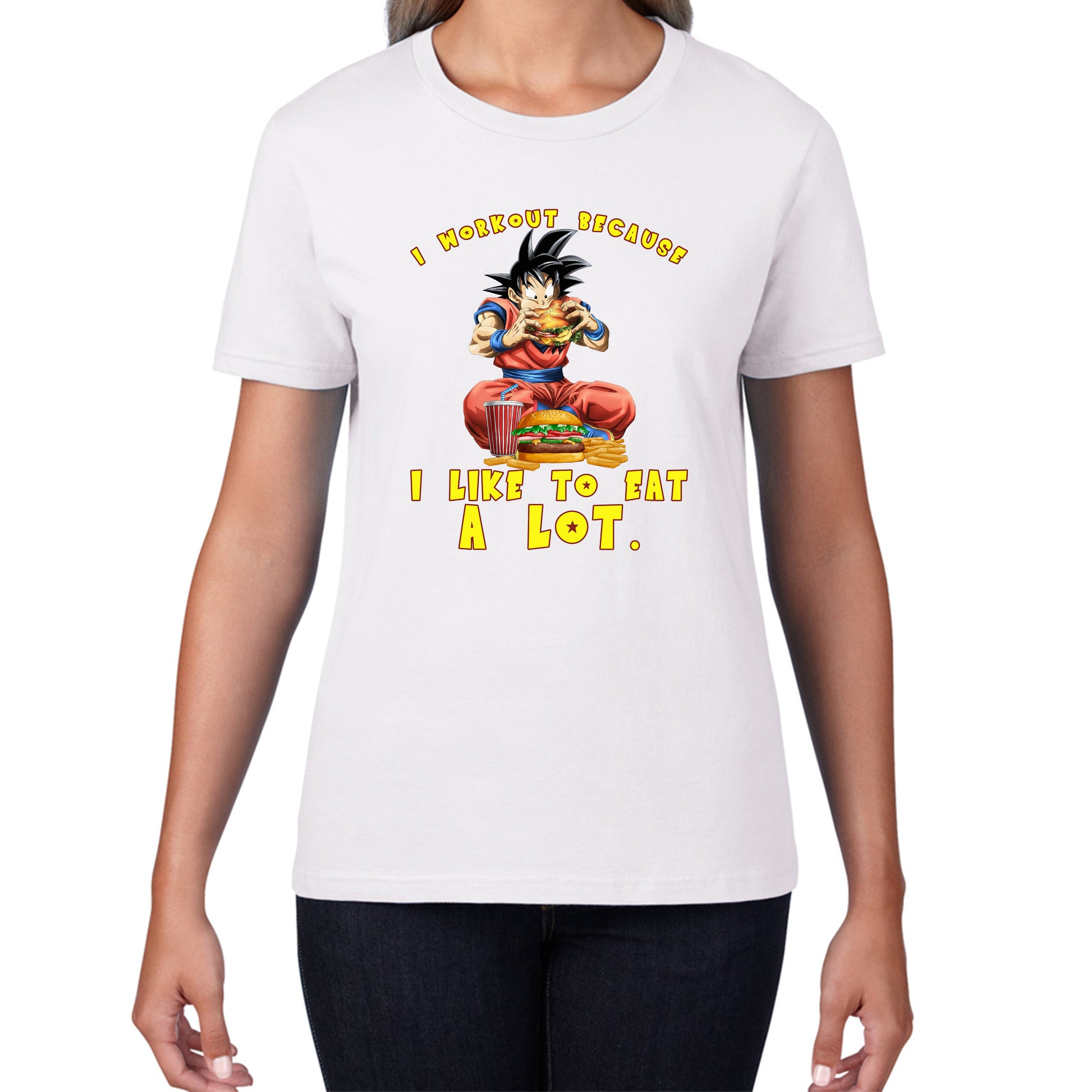 I Workout Because I Like To Eat A Lot Goku Eating A Hamburger Dragon Ball Anime Gym Bodybuilding Workout Womens Tee Top