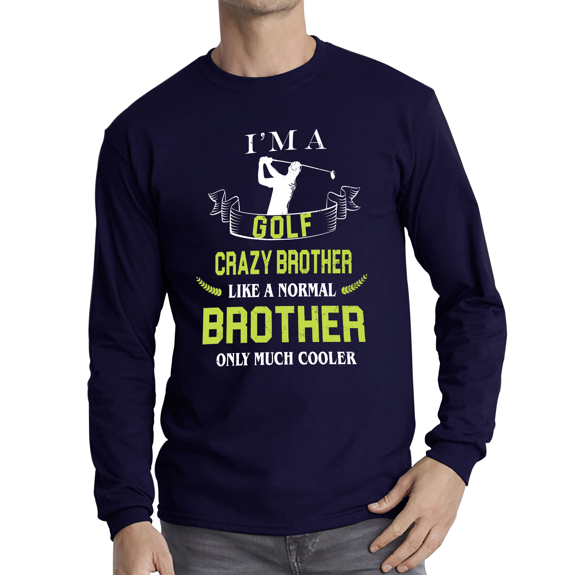 For the brother who lives and breathes golf, this long sleeve T-shirt says it all! Featuring the playful slogan, "I'm A Golf Crazy Brother Like A Normal Brother Only Much Cooler," this shirt is perfect for those who hit the greens as often as they can. Whether you're teeing off or just hanging out, this comfortable and stylish tee is a hole-in-one.