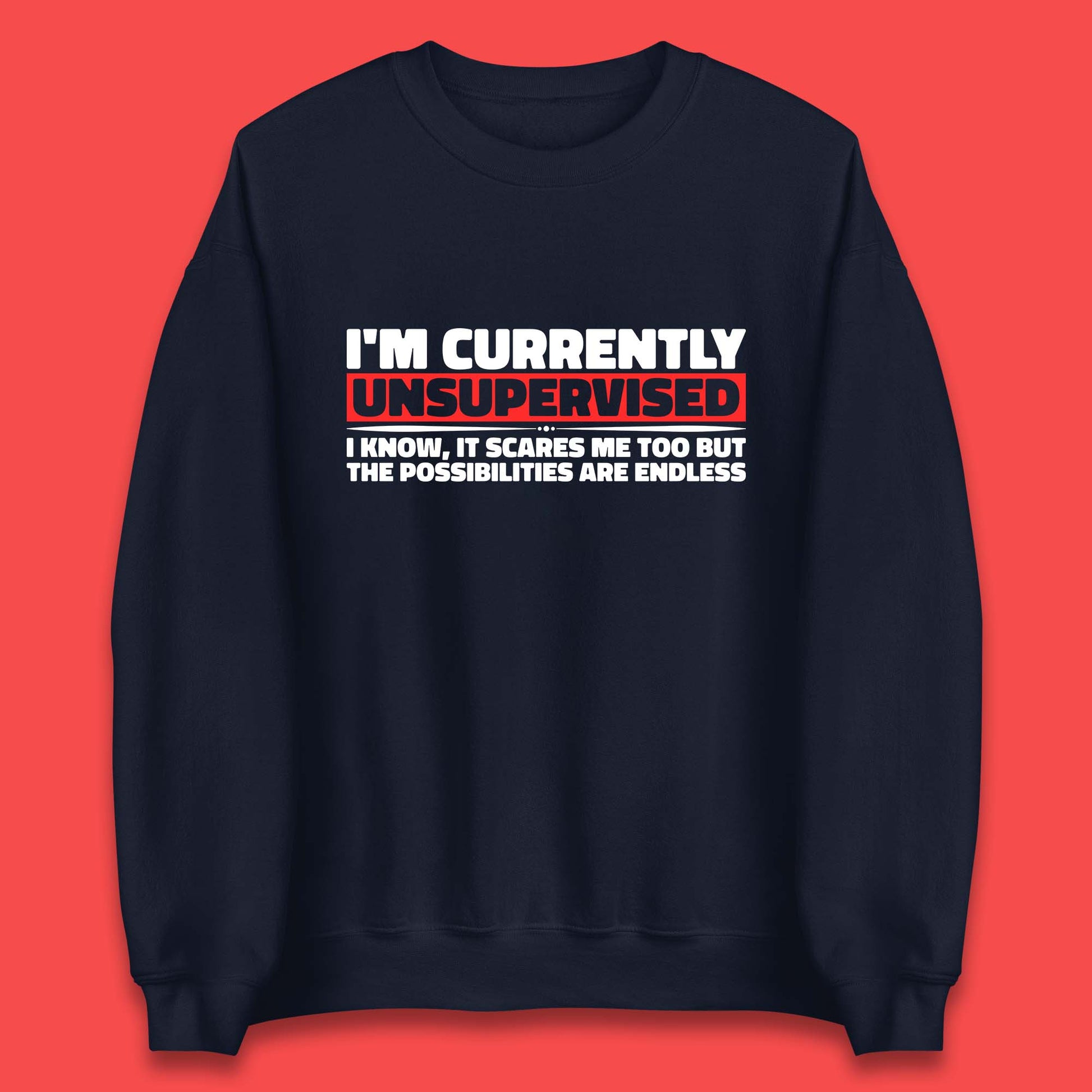 I'm Currently Unsupervised I Know It Scares Me Out Too But The Possibilities Are Endless Hilarious Funny Saying Unisex Sweatshirt
