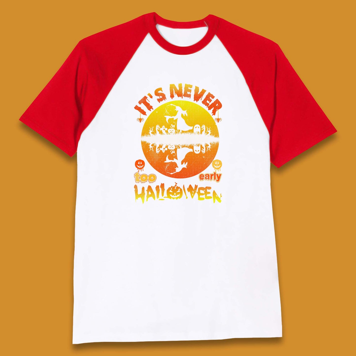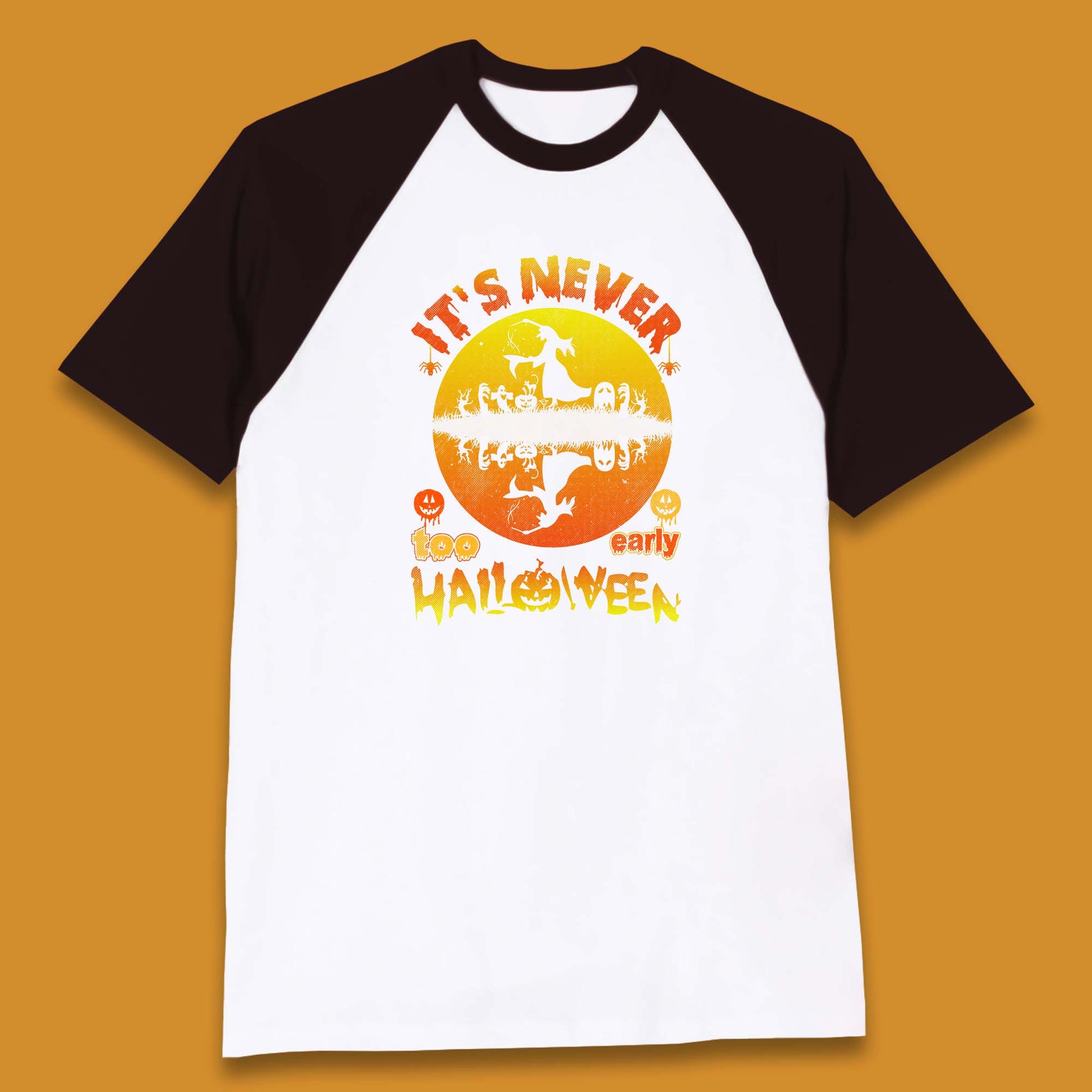 It's Never Too Early Halloween Witch Flying On Broomstick Over Lake Scary Spooky Season Baseball T Shirt