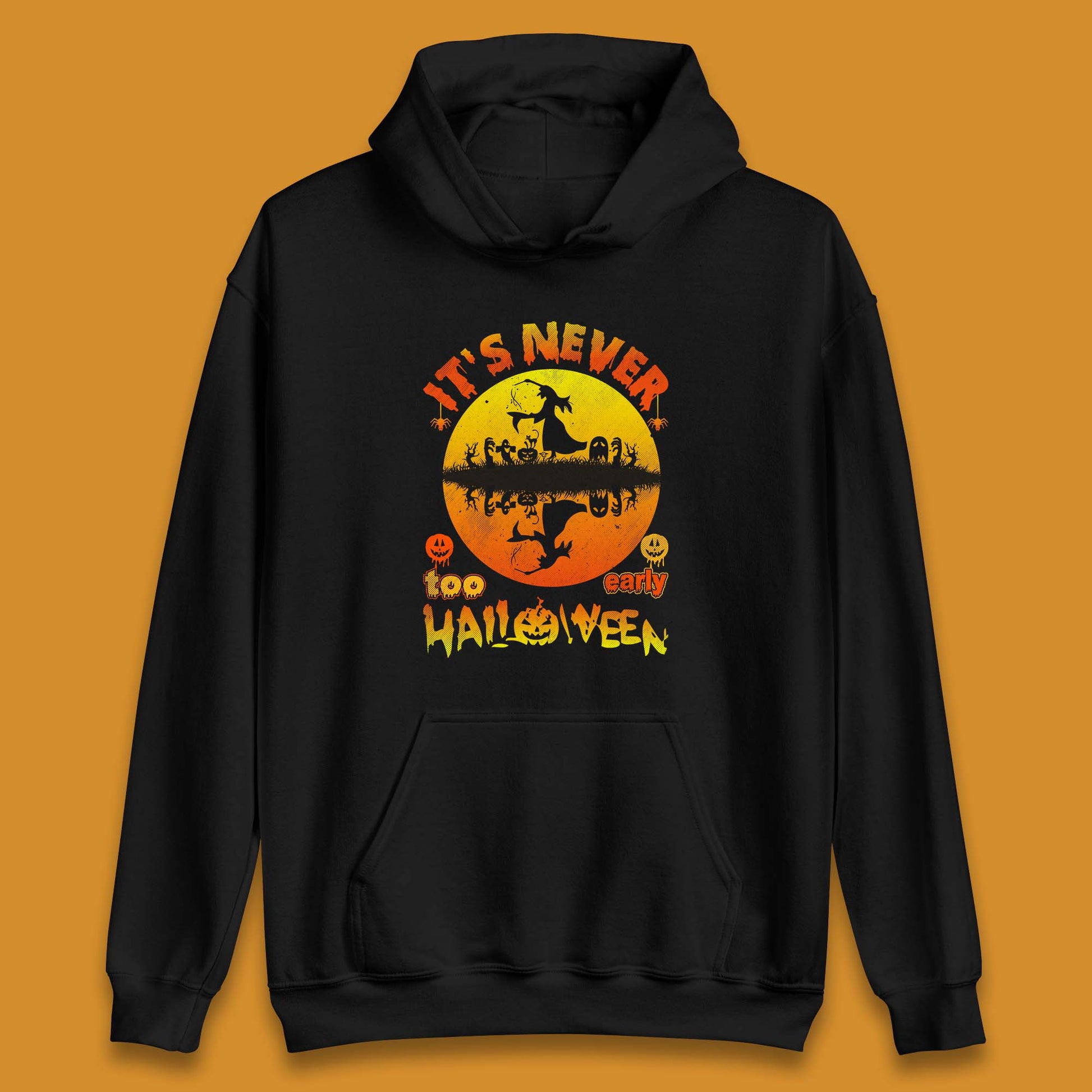 It's Never Too Early Halloween Witch Flying On Broomstick Over Lake Scary Spooky Season Unisex Hoodie