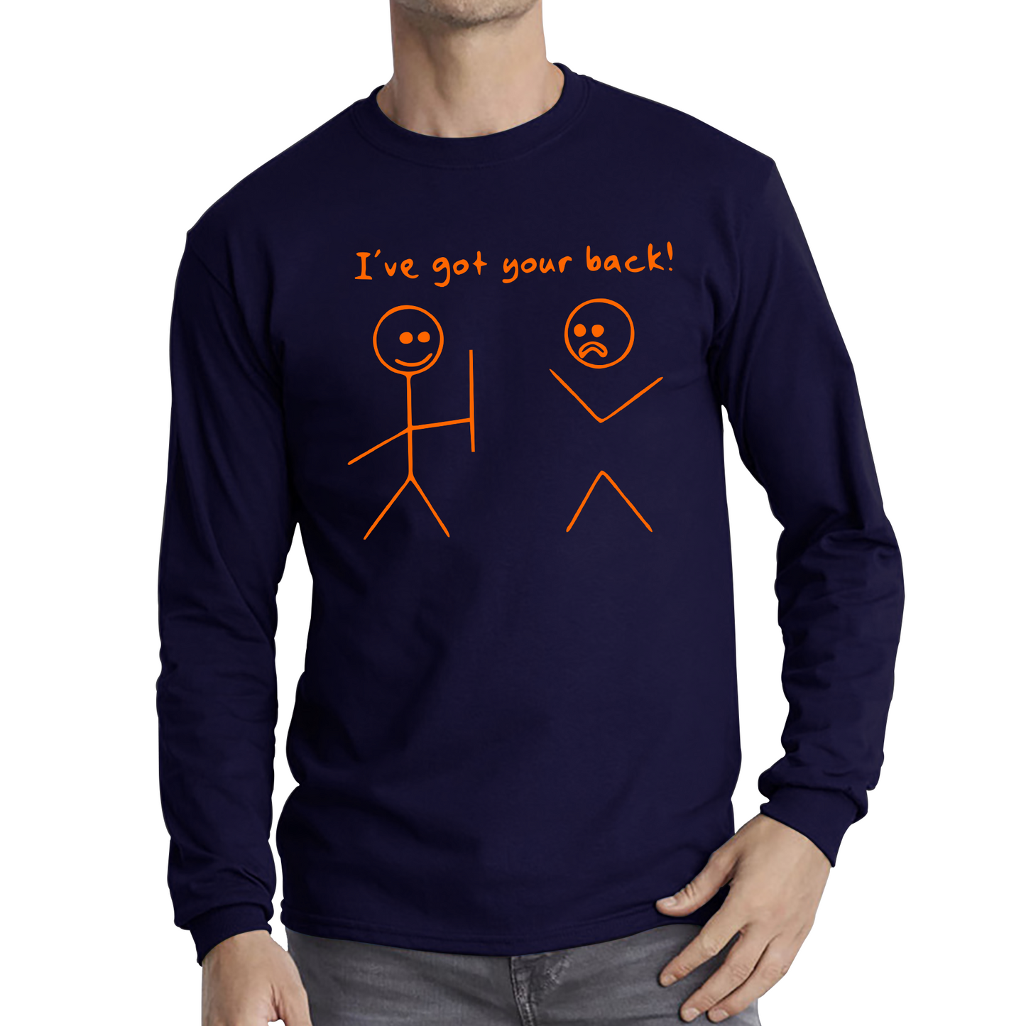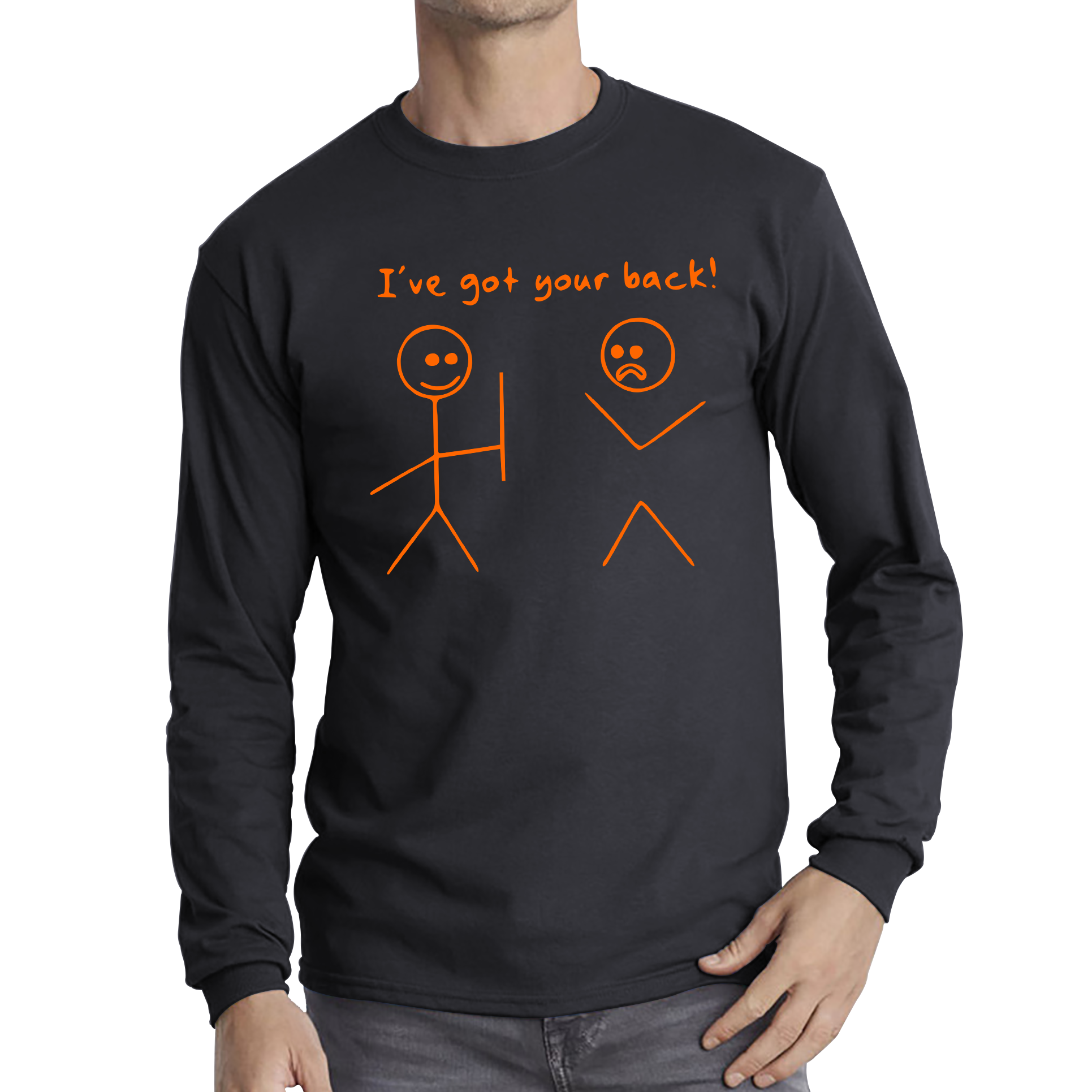 Show your support and spread a smile with our "I've Got Your Back" Long Sleeve T-Shirt. This tee features a fun and minimalist design, capturing the essence of having someone’s back with a clever graphic of a stick figure supporting another. It’s perfect for those who appreciate both humor and comfort in their wardrobe.