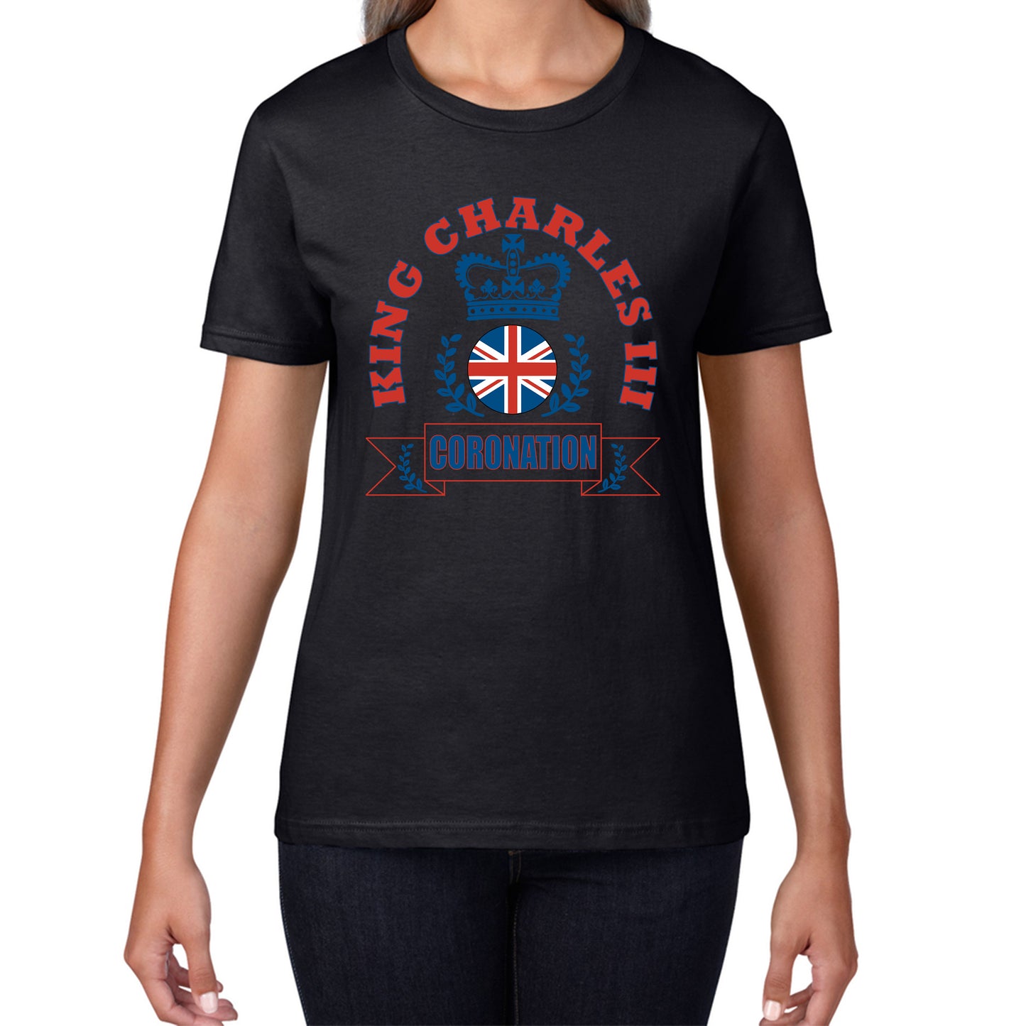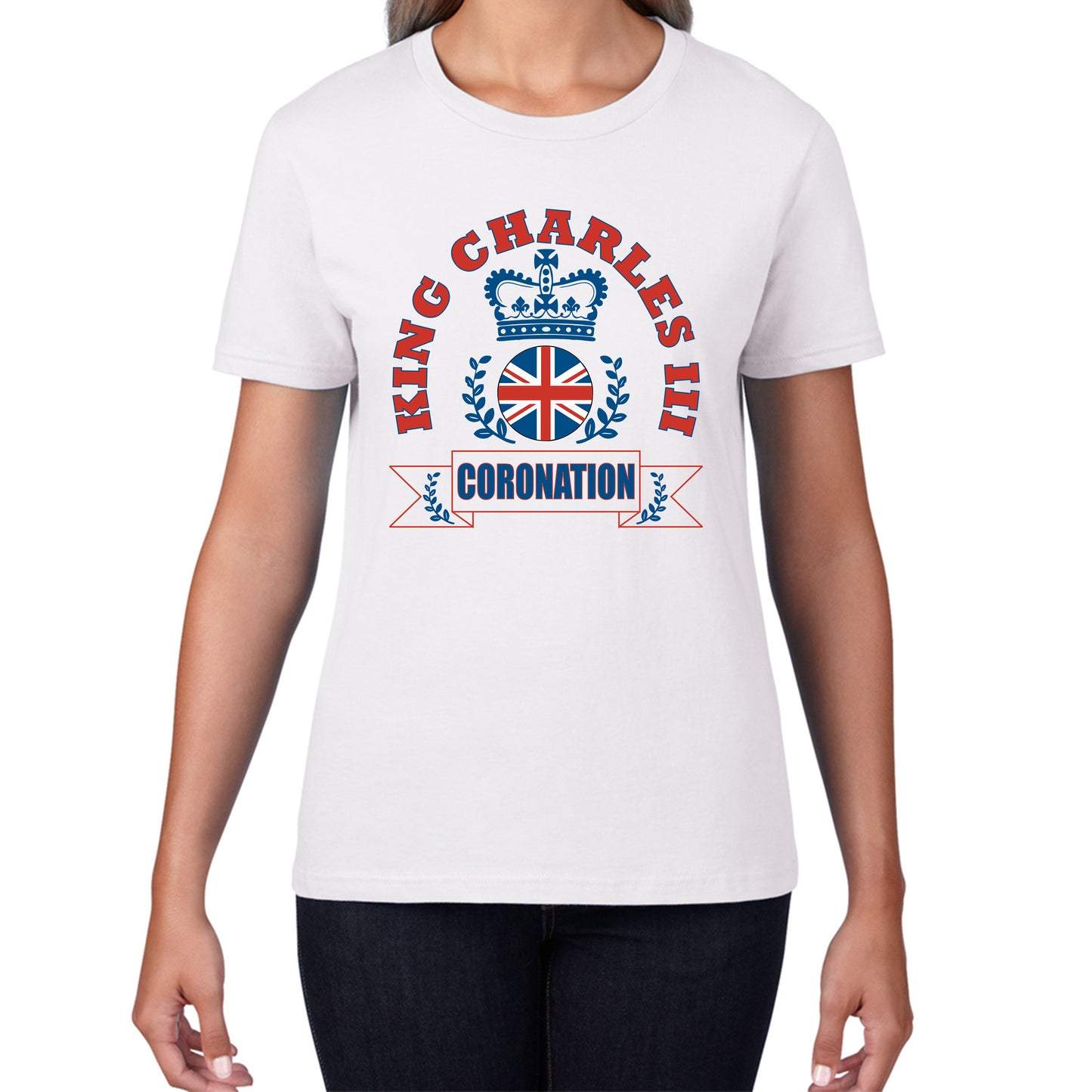 King Charles III 2023 Coronation God Save The King Royal Crown CR III His Majesty Union Jack Uk Flag Womens Tee Top