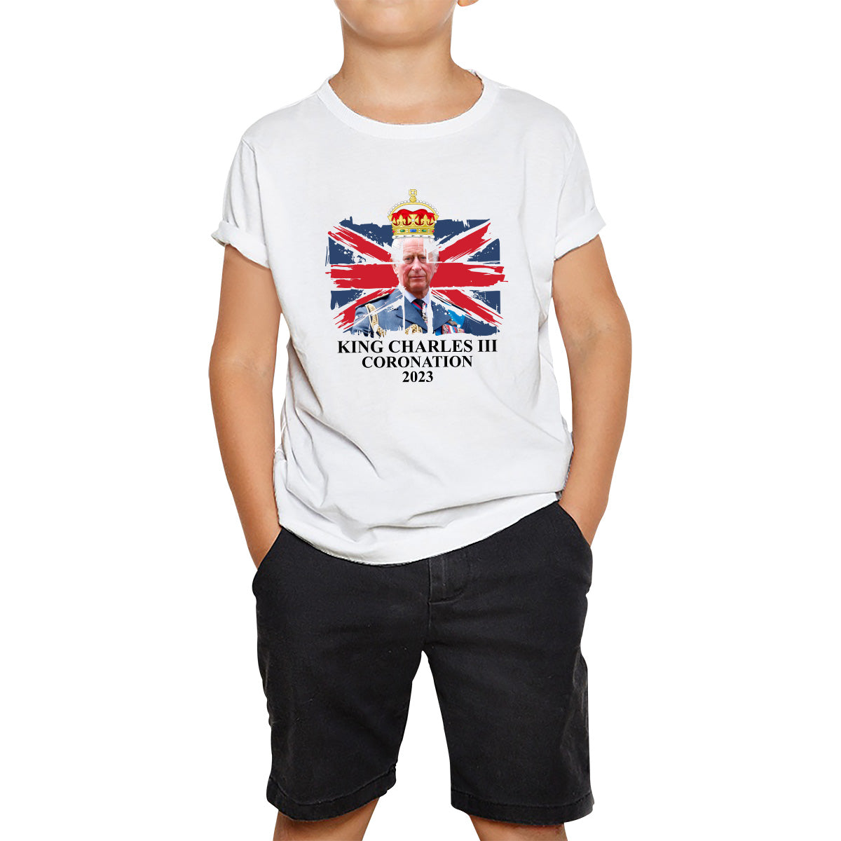 King Charles III Coronation 2023 British Flag Royal Crown God Save The King Royal Cypher Kids T Shirt