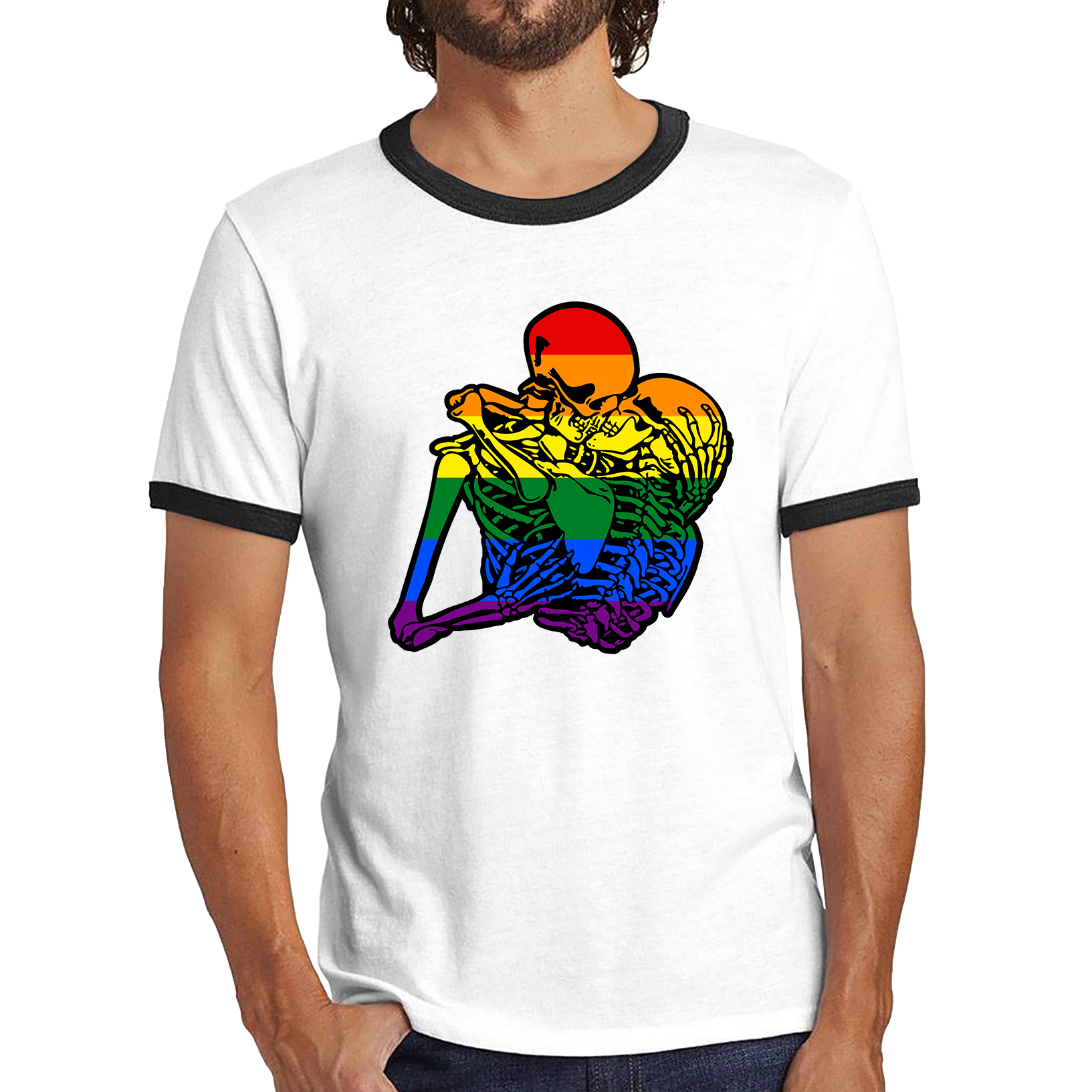 Kissing Skeletons Gay Pride LGBT Gay Skull Halloween LGBTQ+ Rainbow Pride Month Ringer T Shirt