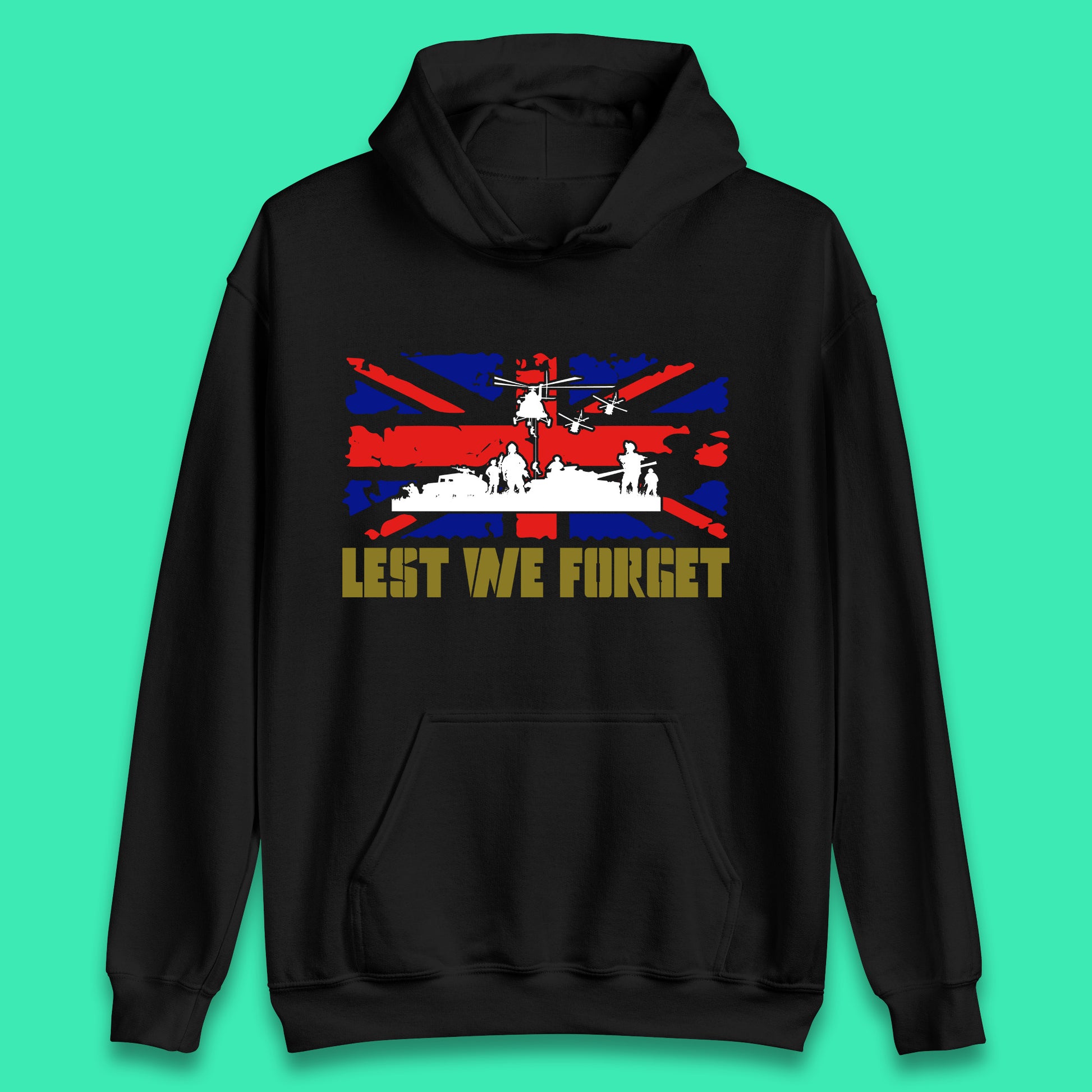 Lest We Forget Armed Forces Veterans Remembrance Day Uk Flag British War Soldiers Unisex Hoodie