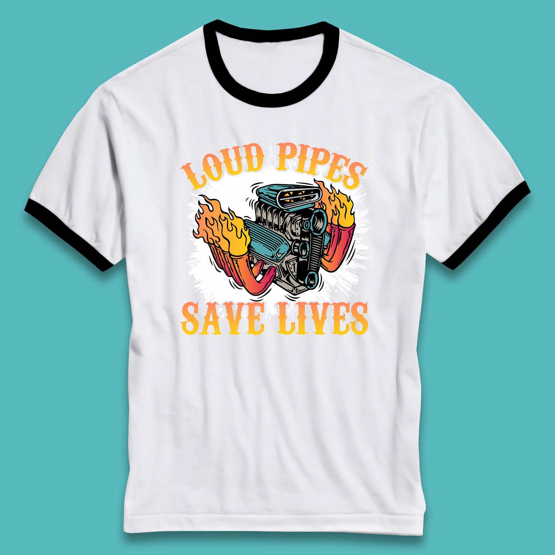 Loud Pipes Save Lives Hot Rod Motor Vehicle Flaming Engine Ringer T Shirt