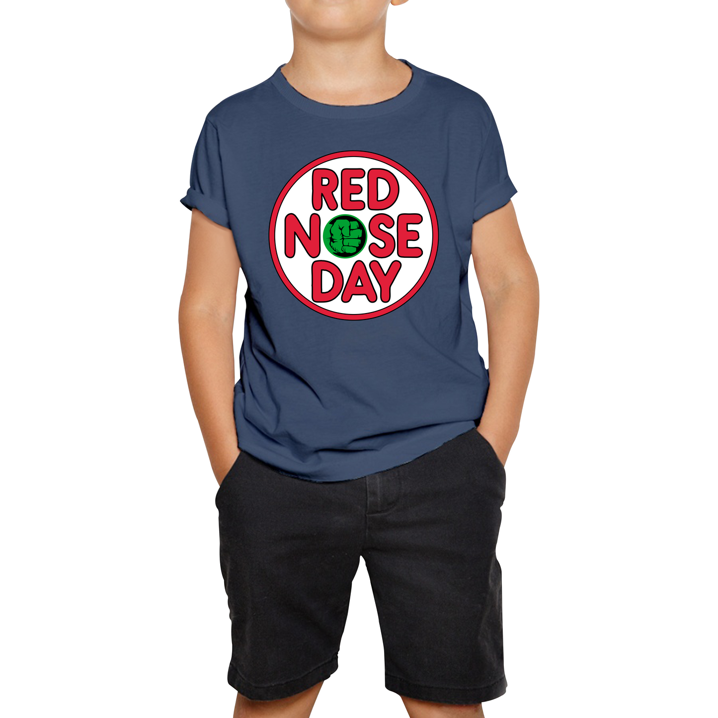 Let your child show off their superhero style and support a fantastic cause with the Hulk Hand Red Nose Day Kids T-Shirt. Featuring a dynamic graphic of the Hulk’s hand adorned with a playful red nose, this t-shirt combines fun design with a commitment to making a positive difference.