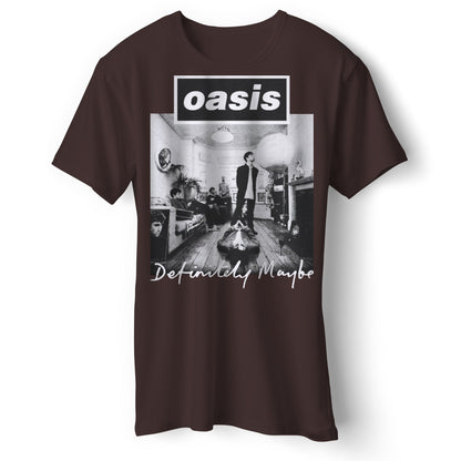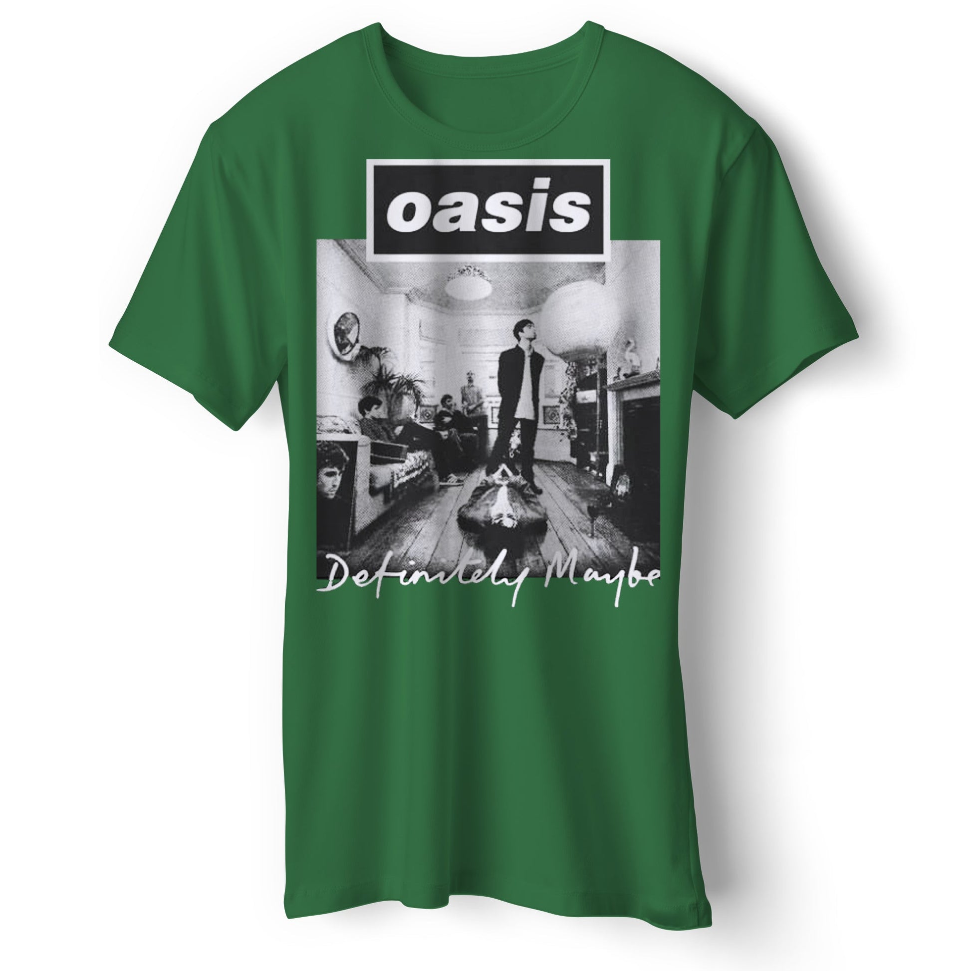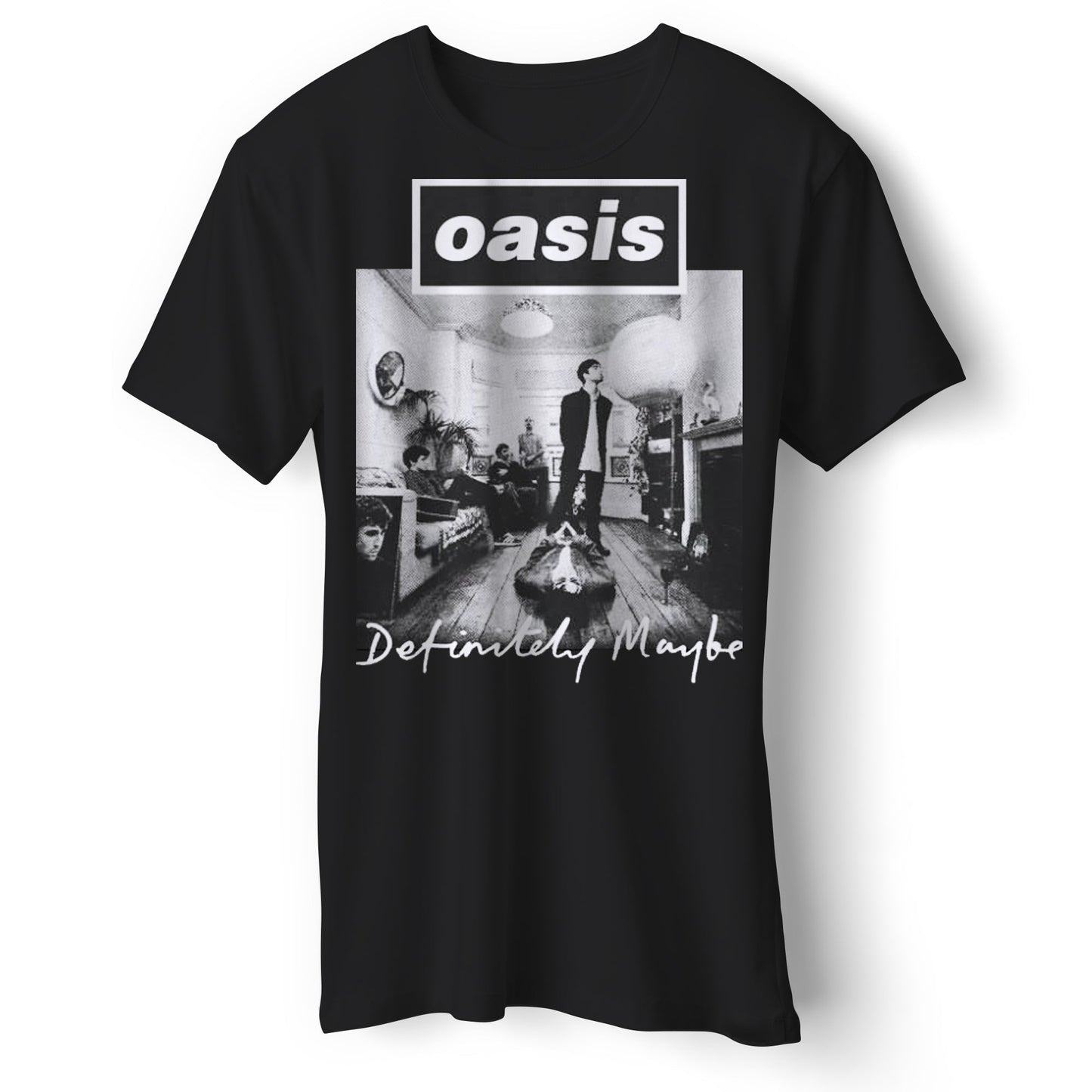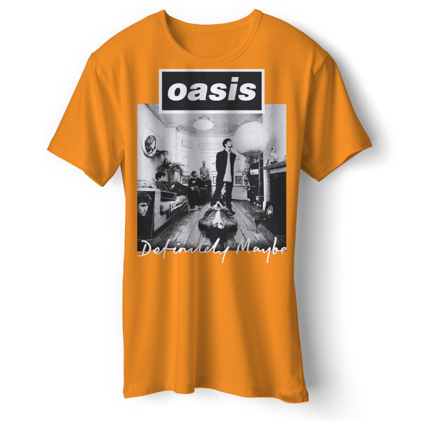 Made from 100% cotton the reactive dyed crew neck oasis definitely maybe t-shirt is taped shoulder to shoulder with enzyme washed twin and needle stitching on neck & shoulders. The unisex t-shirt is available in 10 colours and 10 sizes.
