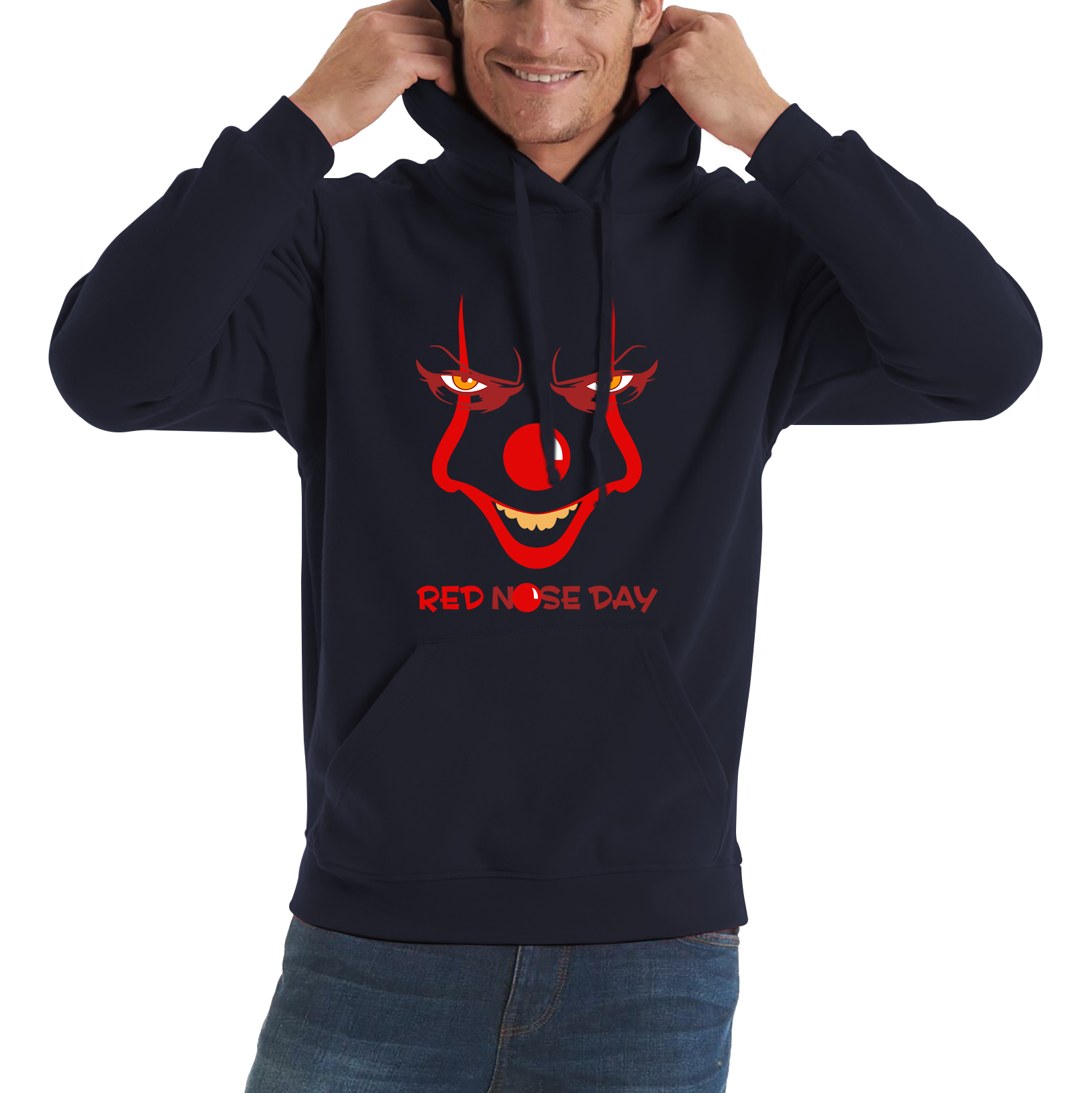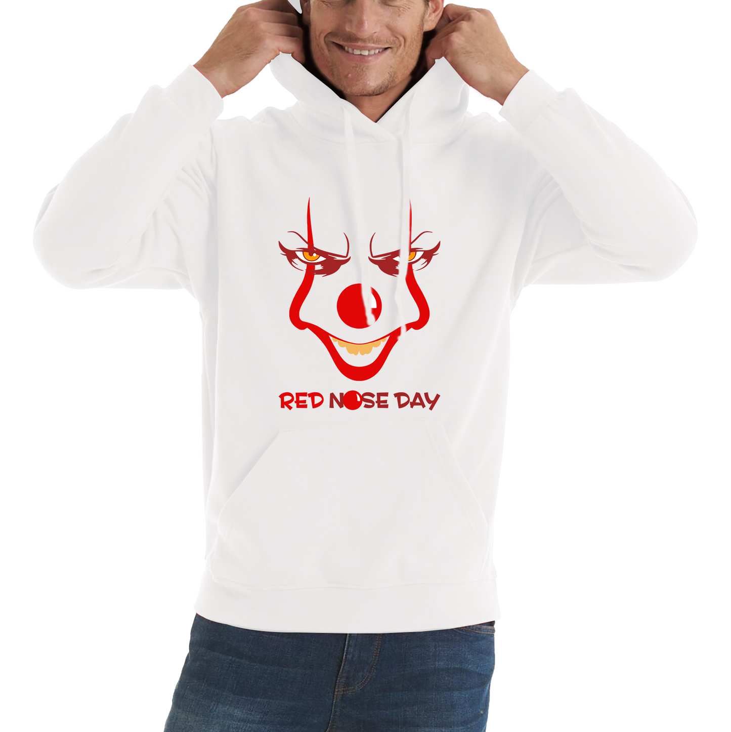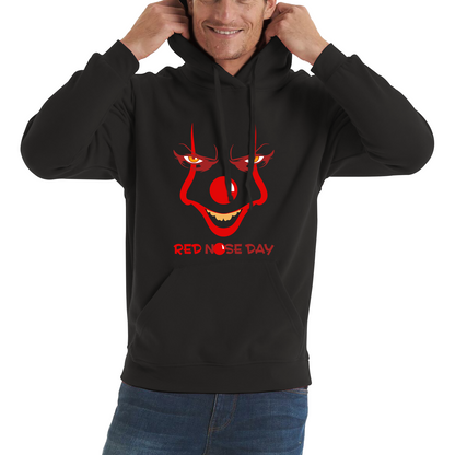 Dive into a unique and playful twist on classic horror with the Pennywise Clown Face Red Nose Day Unisex Hoodie. Featuring a striking graphic of the iconic Pennywise clown from It, this hoodie adds a touch of spooky fun to your Red Nose Day celebrations while supporting a great cause.