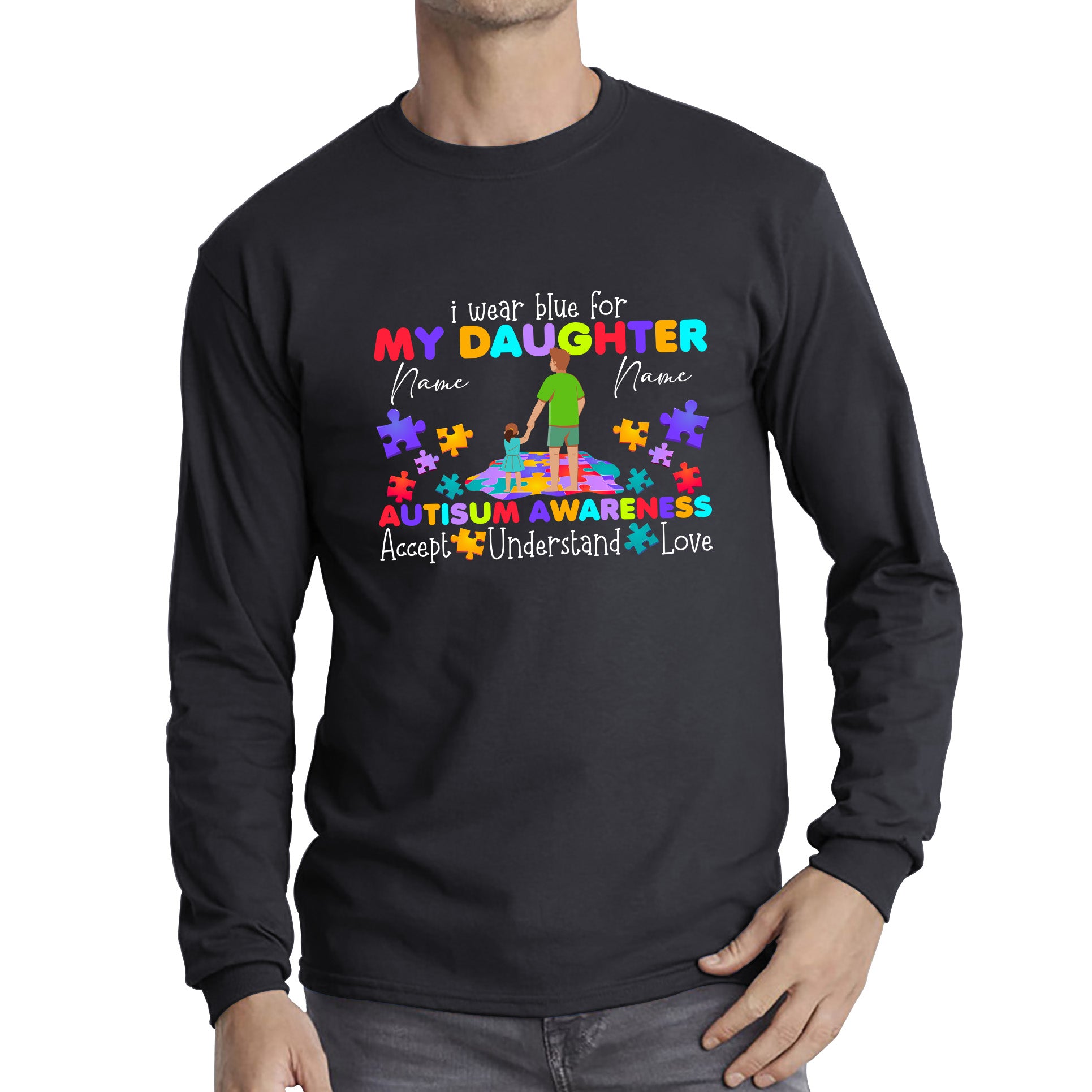 Personalised I Wear Blue For My Daughter Autism Awareness Father & Daughter Name Autism Warrior Puzzle Pieces Accept Understand Love Long Sleeve T Shirt