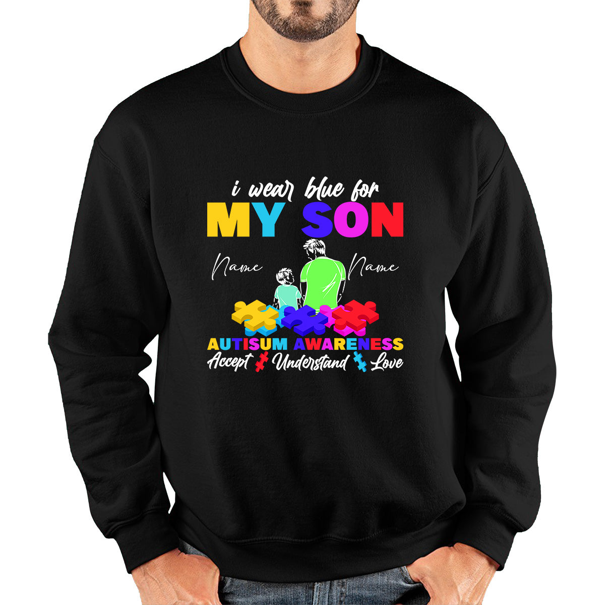 Personalised I Wear Blue For My Son Autism Awareness Accept Understand Love Father & Son Name Autism Warrior Puzzle Pieces Unisex Sweatshirt